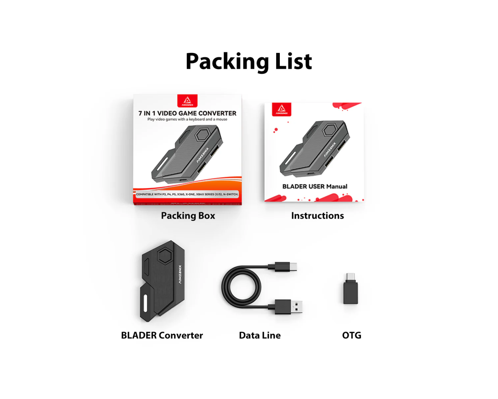 Blader Adapter är en mus- och tangentbordsadapter från Aimzenix som ger gamers möjlighet att använda sina föredragna enheter på konsoler som Xbox, Nintendo Switch och PlayStation. Adapterns huvudfunktioner inkluderar simulering av tangentbord- och musinputs som kontrolleringssignaler, vilket ökar spelkontrollen. Den erbjuder även anpassningsbara kortkommandon och känslighetsinställningar för att förbättra spelprecision och hastighet i olika spelsituationer.Adapterns design gör den lätt att använda med en plug-and-play-inställning, vilket innebär att uppkopplingen till konsolen är snabb och enkel utan behov av komplex installation eller extra mjukvara. Adaptern stöder inte möss som kräver drivrutinsinstallation och notera att 3.5 mm hörlursuttaget på kontrollen blir inaktivt när den ansluts via Blader. Inkluderat i förpackningen finns Blader-adaptern, en TYP-C datakabel, en OTG-adapter och en bruksanvisning.
