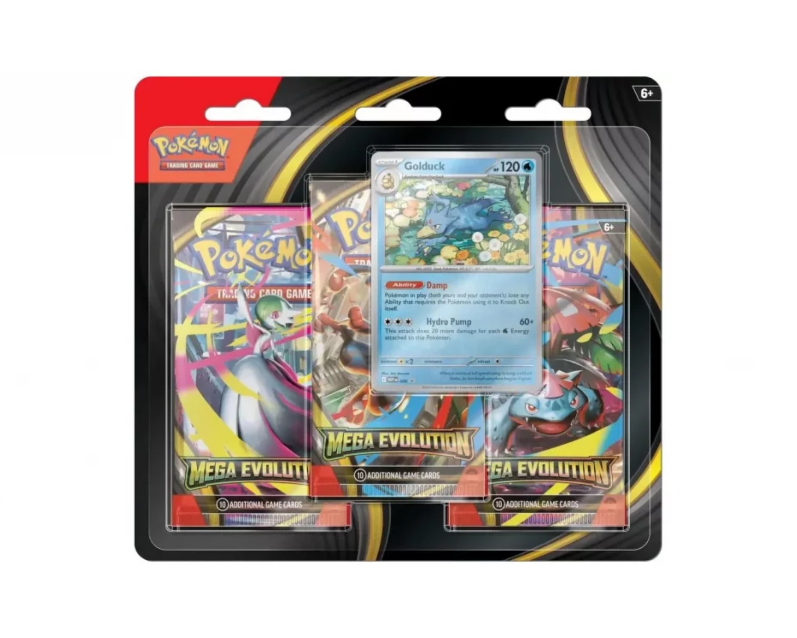 Mega Evolution Blister 3-Pack är ett samlarkortset från Pokémon som erbjuder en unik upplevelse för samlare och gamers. Setet inkluderar ett speciellt foil promo-kort med antingen Psyduck eller Golduck, vilket ger en extra dimension till samlingen. Dessutom ingår tre booster packs från Pokémon TCG: Mega Evolutions, där varje pack innehåller 10 spelkort samt 1 Basic Energy eller TCG Live-kodkort. Kortens variation ger en spännande och oförutsägbar spelupplevelse.Det unika foil promo-kortet är en samlarobjekt som kan stärka spelarens kortsamling och strategier i spelet. Booster packs är noggrant sammanställda och innehåller kort av olika typer och sällsyntheter, vilket gör varje öppning till en intressant upplevelse. Setet riktar sig till inbitna Pokémon-samlare och gamers som är intresserade av att utöka sina kort och strategier i Pokémon TCG. Särskilt fokus läggs på att korten i booster packs varierar, vilket gör varje set unikt.