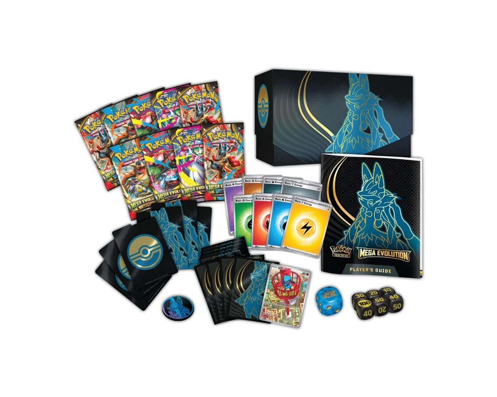 Inuti lådan finner du 9 Pokémon TCG: Mega Evolution booster packs, vilka innehåller 10 kort och en Basic Energy eller ett Pokémon TCG Live-kodkort. Det finns även 65 kort sleeves som skyddar dina kort, 40 Pokémon TCG Energy-kort för att stödja energibehoven i spelet och en spelarens guide till Mega Evolution-expansionen för vägledning. För att hålla spelet organiserat ingår också 6 damage-counter tärningar, en tävlingsgodkänd myntkast-terning samt en plastmynt. En kodkort till Pokémon Trading Card Game Live är även inkluderat.