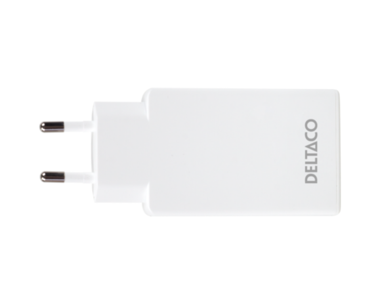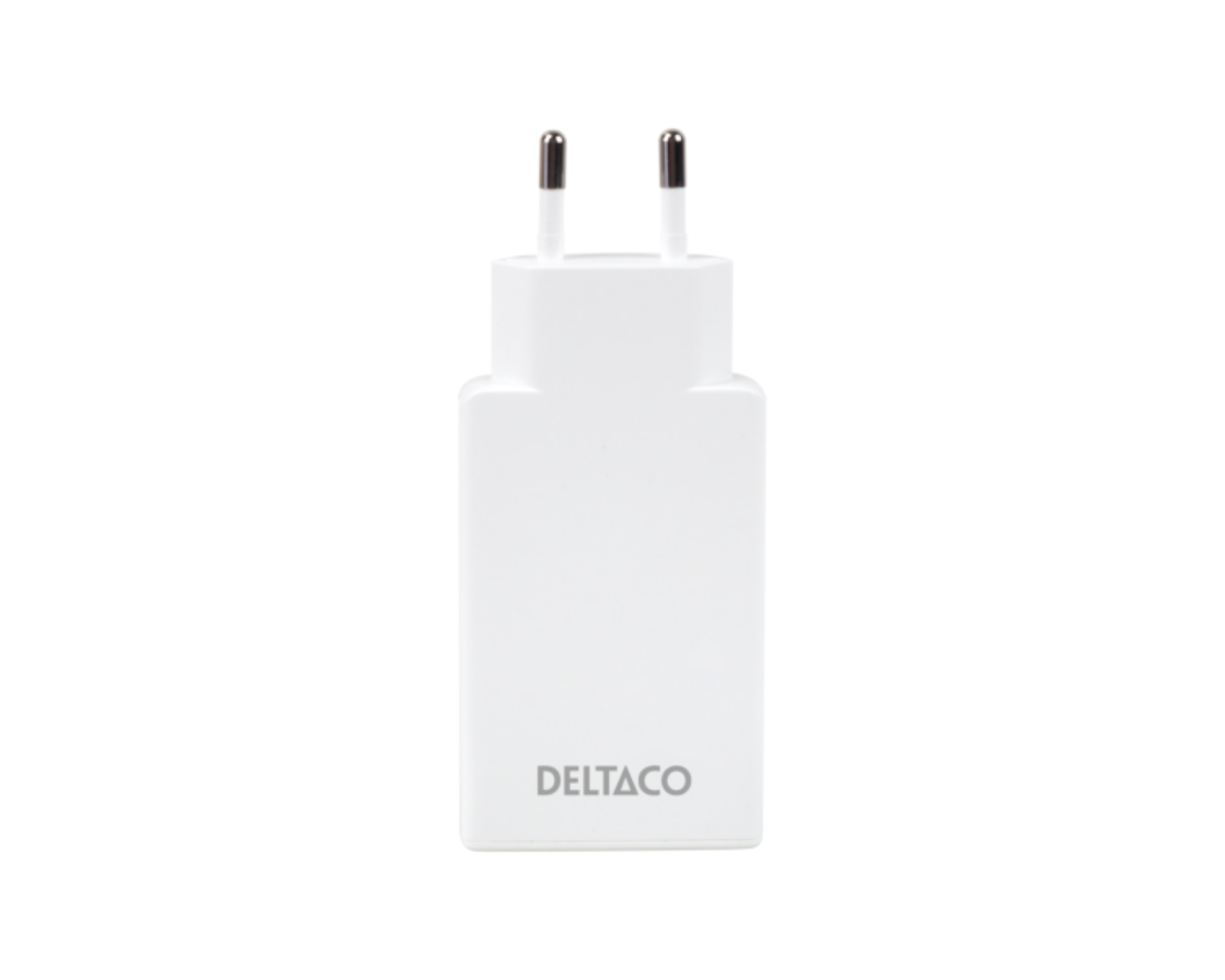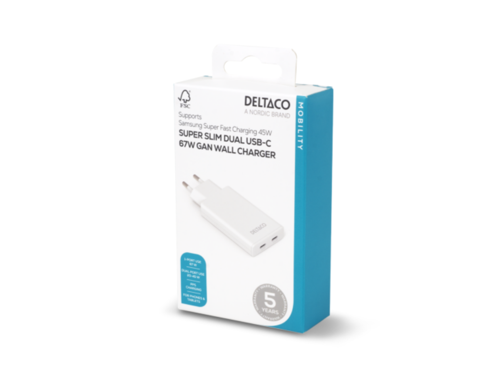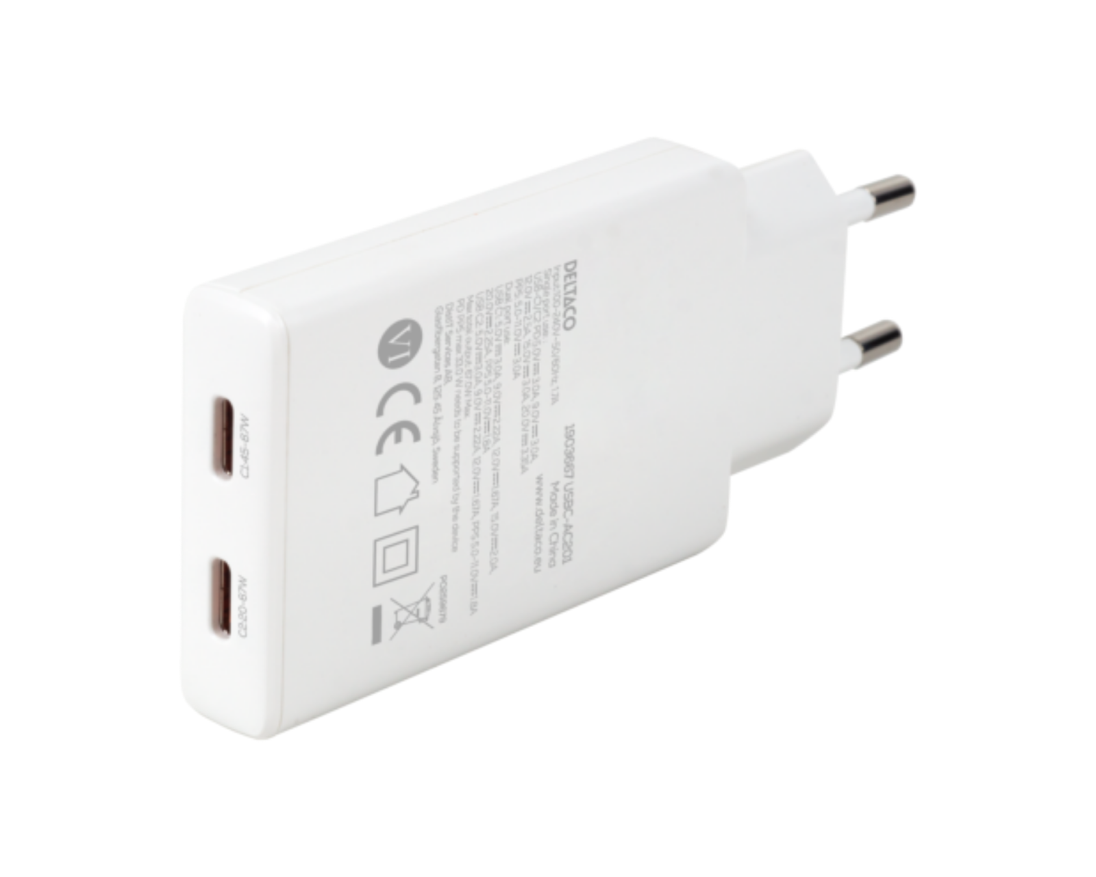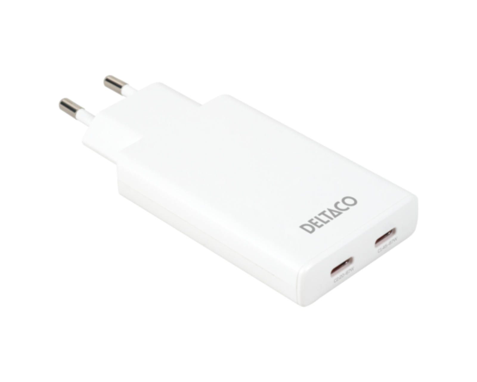 67W 2x USB-C väggladdare är en väggladdare från Deltaco som erbjuder snabb och effektiv laddning med en total effekt på 67 W. Den är utrustad med två USB-C PD-portar, vilket gör den lämplig för laddning av telefoner, surfplattor och bärbara datorer. Portarna kan användas individuellt eller tillsammans, vilket möjliggör flexibilitet i laddningsalternativen.Laddaren stödjer PPS-laddning som optimerar ström och spänning i realtid beroende på enhetens laddningsstatus. När en port används kan den ge upp till 67 W och när båda portarna används är maxeffekten 45 W för port C1 och 20 W för port C2. Laddarens slimmade design gör den perfekt för resor och den kräver att enheten som laddas stöder PPS för optimala resultat.