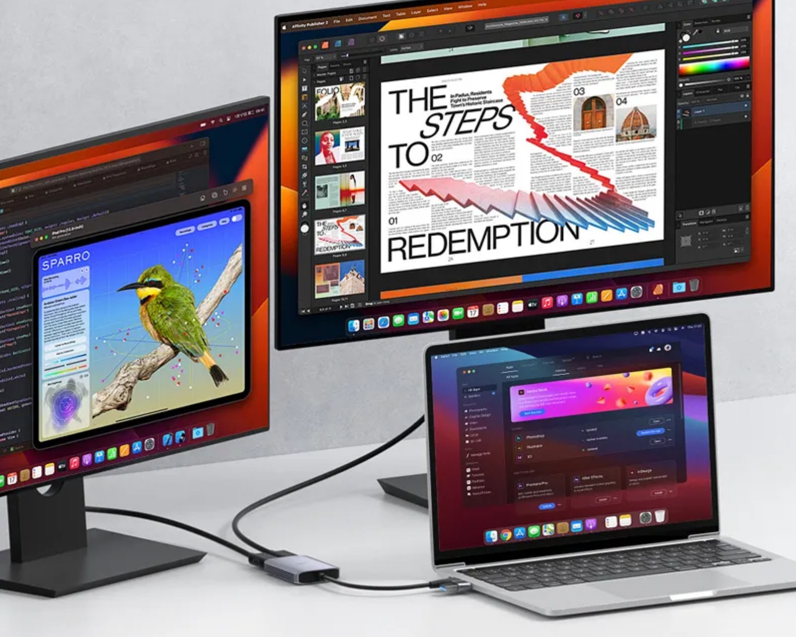 USB3.0 till HDMI Adapter är en adapter från Hagibis som gör det möjligt att ansluta flera externa skärmar till Apple-datorer som är utrustade med M1-, M2- eller M3-chip. Produkten erbjuder stöd för att öka produktiviteten genom att möjliggöra visning på tre skärmar samtidigt, antingen i samma visningsläge eller olika visningslägen. Adapterns mångsidighet gör den lämplig för olika användningsområden, särskilt inom multitasking och presentationsmiljöer.Adapterns design inkluderar stöd för både USB-C och USB-A gränssnitt, vilket gör det möjligt att enkelt växla mellan olika enheter. Den erbjuder en högupplöst utvidgning med en kapacitet för 1080P/60Hz bildkvalitet, vilket säkerställer att färger återges korrekt och att ljud och video synkroniseras. Därtill är adapterns konstruktion med en ihålig aluminiumkapsling och värmeavledande fenor effektiv för värmehantering. Enheten är också kompakt och lätt, vilket underlättar transport.