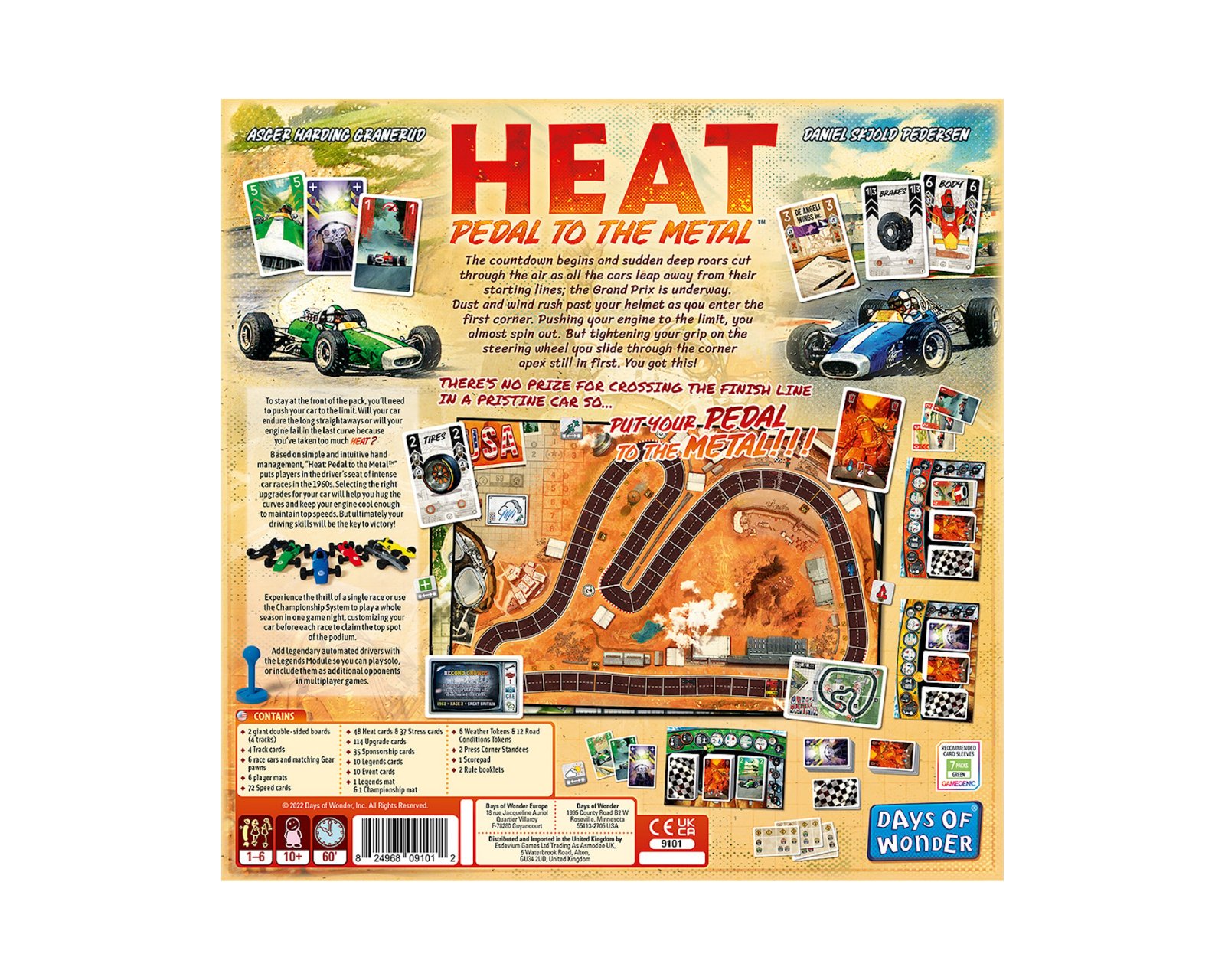 HEAT är ett brädspel som erbjuder en enkel och intuitiv användning av kort och sätter gamern i förarsätet under kaotiska biltävlingar som ägde rum på 1960-talet. Spelare kan välja mellan enstaka lopp eller mästerskapsregler för att spela hela säsongen, och varje lopp kräver strategiska förbättringar av bilen för att hantera kurvor och hålla motorn sval vilket är centralt för att nå toppfart. Spelet är designat för 1-6 spelare vilket möjliggör flexibel spelupplevelse, oavsett om man spelar ensam eller med andra.Detaljerna i spelets komponenter är noggrant utformade för att skapa en autentisk spelupplevelse. Bilkorten representerar olika fordon från 1960-talet och kommer med specifika egenskaper som påverkar spelets dynamik. Genom att implementera legendariska automatiserade drivrutiner via legendmodulen får gamern möjlighet att utöka sin spelstrategi och konkurrenskraft, vilket gör att det finns oändliga möjligheter att justera taktiken.