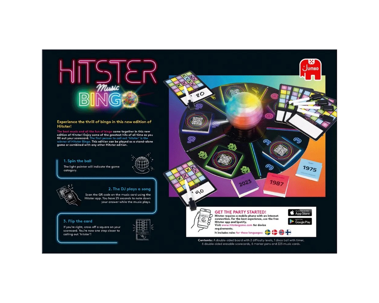 Hitster Bingo Nordic är ett brädspel som kombinerar musik med spelmoment och är avsett för en bred publik. I denna variant snurrar spelarna på en discokula för att avslöja kategorier. Spelarna skannar kort och gissar olika musikrelaterade frågor, såsom årtionden, sångare eller band, samt exakta årtal eller huruvida låtarna är före eller efter 2000-talet. För att vinna ska en spelare fylla en rad eller kolumn med de fyra kategorierna.Spelet inkluderar 225 musikkort, en disco kula, en timer med färgade lampor samt sex Wipe-Off boards med pennor för markering. Genom den kostnadsfria Hitster-appen får spelare ytterligare stöd och möjligheter att engagera sig i spelet. Spelet är designat att förena musikälskare och förse dem med underhållning över flera spelomgångar.