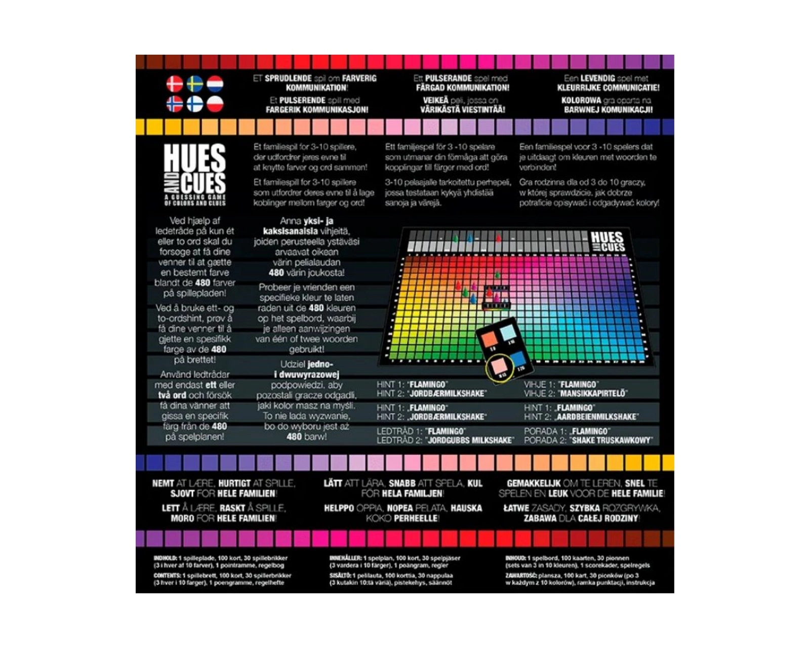 Hues And Cues är ett sällskapsspel som erbjuder en kreativ och underhållande upplevelse för 3–10 spelare. Spelet fokuserar på att gissa färger utifrån en ledtråd i form av ett eller två ord. Med en spelplan som innehåller hela 480 färgnyanser skapas en dynamisk och engagerande spelmiljö där spelarna försöker placera sina markörer så nära den riktiga nyansen som möjligt. Speltiden är cirka 30 minuter och spelet är designat för personer från 10 år och uppåt.Spelplanen är utformad med 480 färgnyanser, vilket gör det möjligt att utforska färger på djupet. Färger kan uppfattas olika av olika individer, vilket skapar en intressant samtalsöppnare. Med spelregler på flera nordiska språk och kompletta komponenter som färgmarkörer, ordledtrådskort, poängblock och pennor, gör det enkelt för gamers att snabbt komma igång. Kvaliteten på materialen är fokuserad på hållbarhet och långvarig användning, vilket säkerställer en pålitlig spelupplevelse vid upprepade spelomgångar.