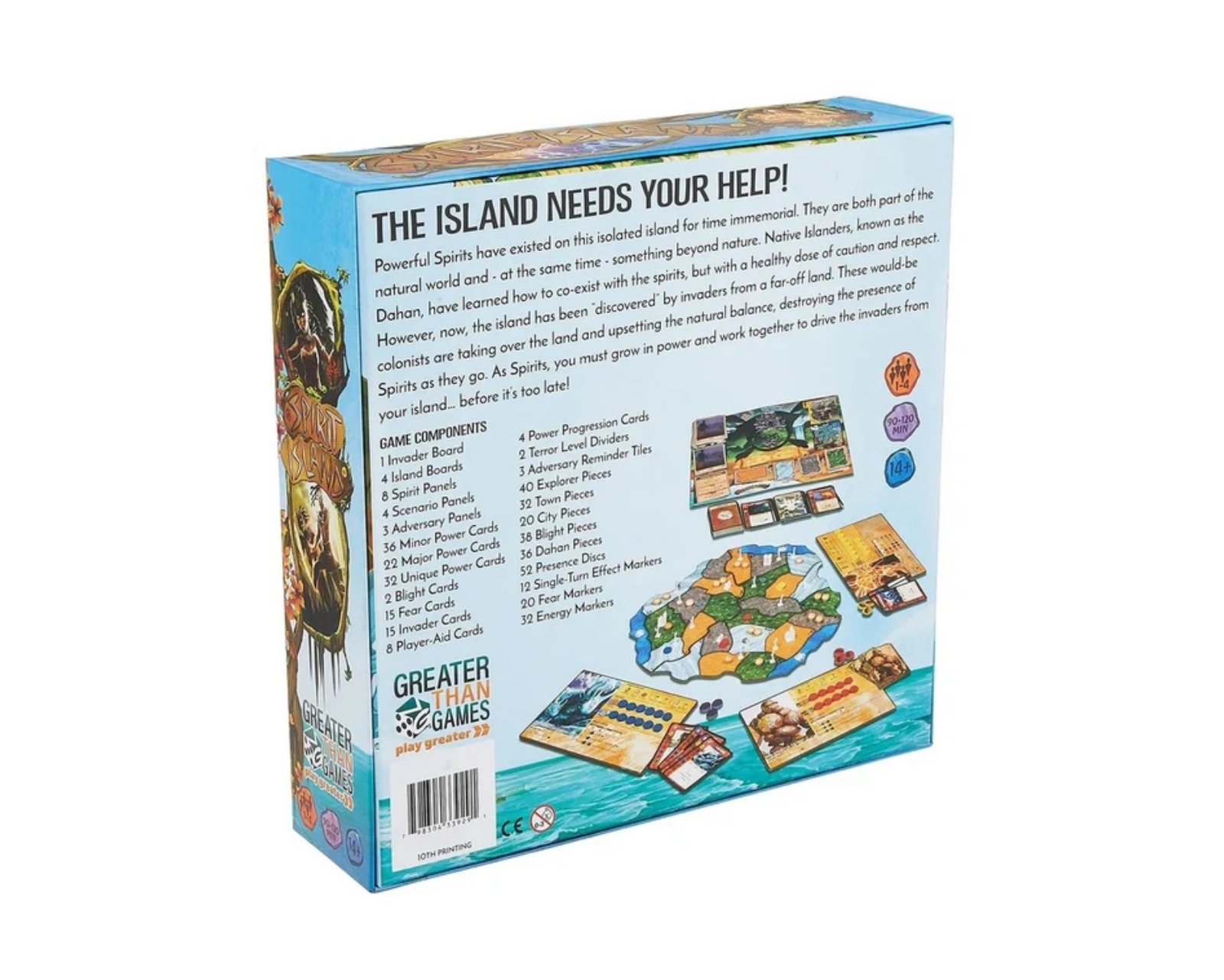 Spirit Island är ett kooperativt brädspel som handlar om att försvara din ö från koloniserande invaderare. Spelet erbjuder varje spelare möjligheten att kontrollera olika andar av landet, var och en med unika elementära krafter. Spelarna väljer simultant vilka kraftkort som ska spelas varje tur, där de kostar energi. Genom att kombinera kraftkort som matchar en andes elementära affiniteter kan spelarna erhålla bonusförmågor. Snabba krafter verkställs omedelbart innan invaderarna hinner sprida sig, medan andra magier kräver mer planering. Under andefasen får andarna energi och väljer hur de växer, antingen genom att återta använda kraftkort, söka ny kraft eller sprida sin närvaro till nya områden på ön.Invaderarna expanderar på kartan i en delvis förutsägbart mönster. Varje tur utforskar de olika delar av ön, bygger bosättningar och städer, och förorsakar blight när de angriper inhemska invånare. Andarna kämpar tillbaka mot invaderarna och skyddar ön. Spelets komplexitet ökar med tiden och erbjuder olika svårighetsgrader, med en rad olika motståndare att bekämpa.