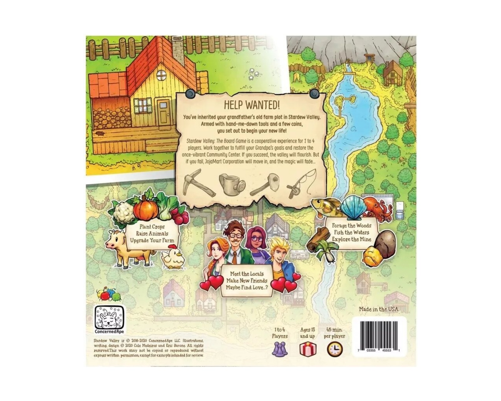 Stardew Valley - Brädspel är ett kooperativt sällskapsspel från Eric Barone, som baseras på det hyllade datorspelet. I Stardew Valley återfinns en rik och levande värld där spelarna samarbetar för att återställa den nedgångna dalen. Spelet uppmanar till strategiskt tänkande genom att odla grödor, föda upp djur och expandera sin gård. Med en spelmekanik som främjar samarbete är målet att förhindra Joja Corporations intrång och bevara dalens charmiga samhälle.Innehållet i spelet omfattar diverse komponenter såsom spelbräde, regelbok, specialbrickor och kort, vilket möjliggör en djup och varierad spelupplevelse. De unika bybor-korten och säsongskorten erbjuder spelarna möjligheter att skaffa sig fördelar genom vänskap och hemliga uppdrag. De olika tärningarna och brickorna bidrar också till att skapa en dynamisk spelmiljö där varje beslut och handling har betydelse. Speltiden är cirka 45 minuter per spelare, vilket gör det till en perfekt aktivitet för spelkvällar i sällskap med vänner och familj.