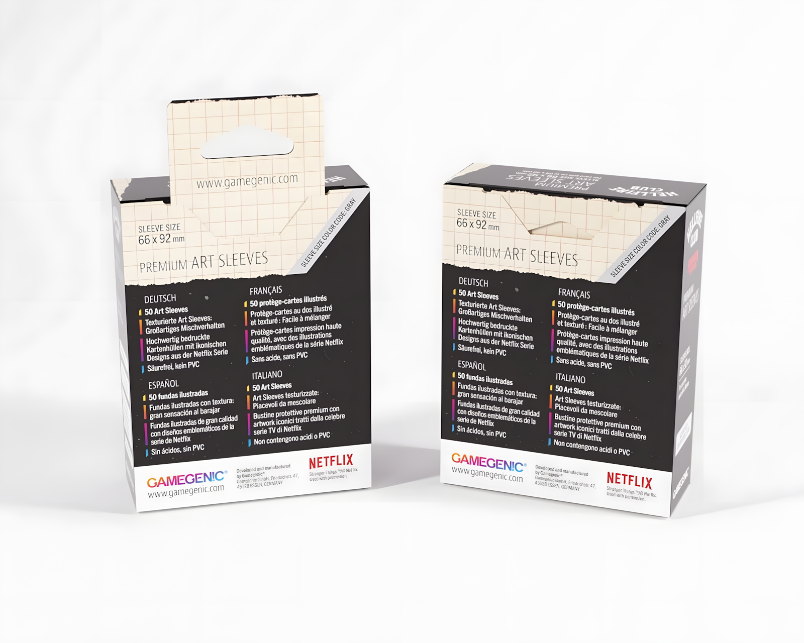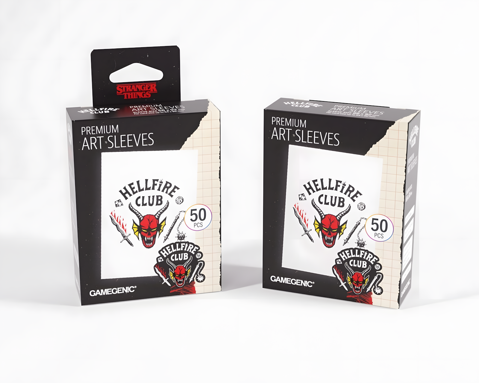 Stranger Things: Hellfire Club Art Sleeves är skyddande ärmar för kortspel, skapade av en officiell licensierad tillverkare. Dessa sleeves erbjuder en bekväm shuffle-känsla och är designade för att passa en mängd olika kortspel. Varje förpackning innehåller 50 ärmar. Storleken på varje sleeve är 66 x 92 mm och de är tillverkade av polypropen.Art Sleeves är tryckta med ikoniska mönster från den populära Netflix-serien och finns i två unika designalternativ. De är försedda med en matt baksida och en transparent framsida, vilket ger en estetisk upplevelse utan att kompromissa med skyddet av korten. Materialet är syrabeständigt och innehåller ingen PVC, vilket säkerställer att korten förblir i gott skick över tid. Dessa ärmar är anpassade för standardstorlekskort och lämpar sig för både samlare och gamers.