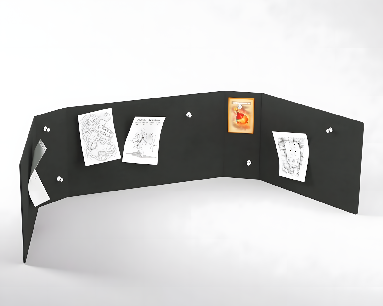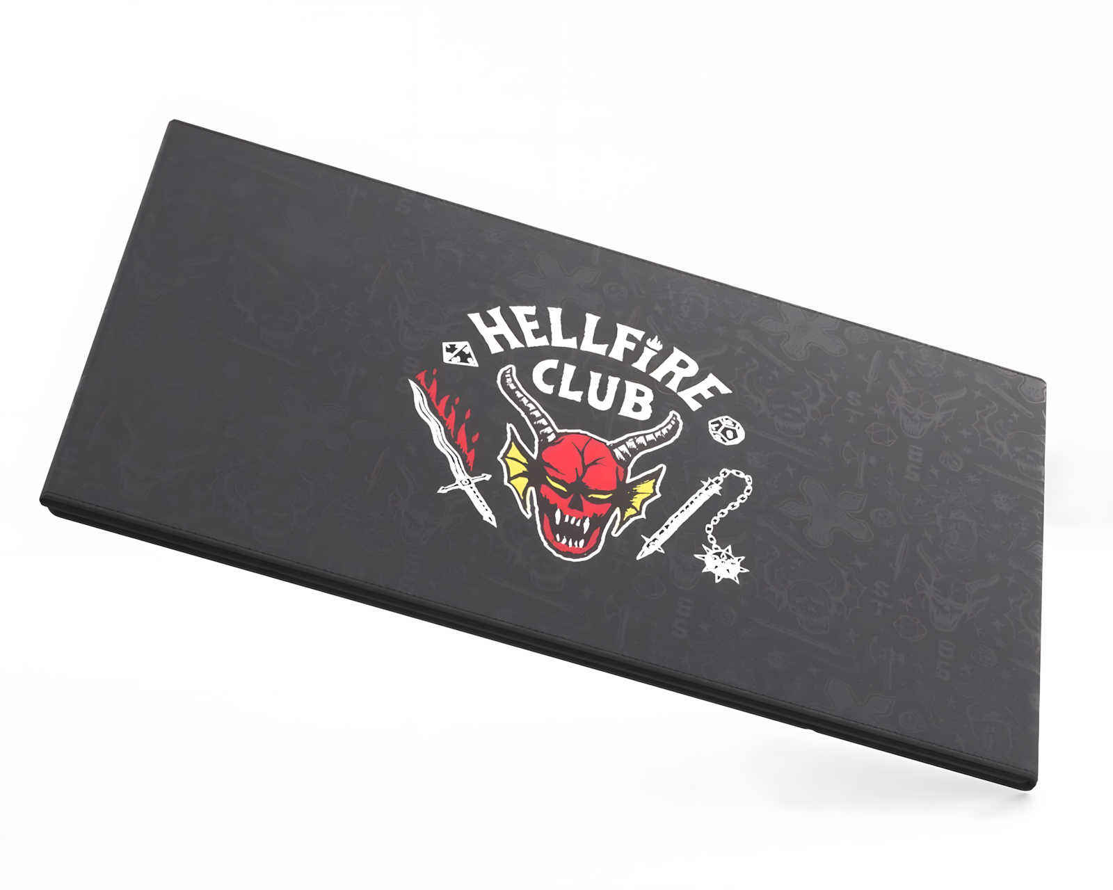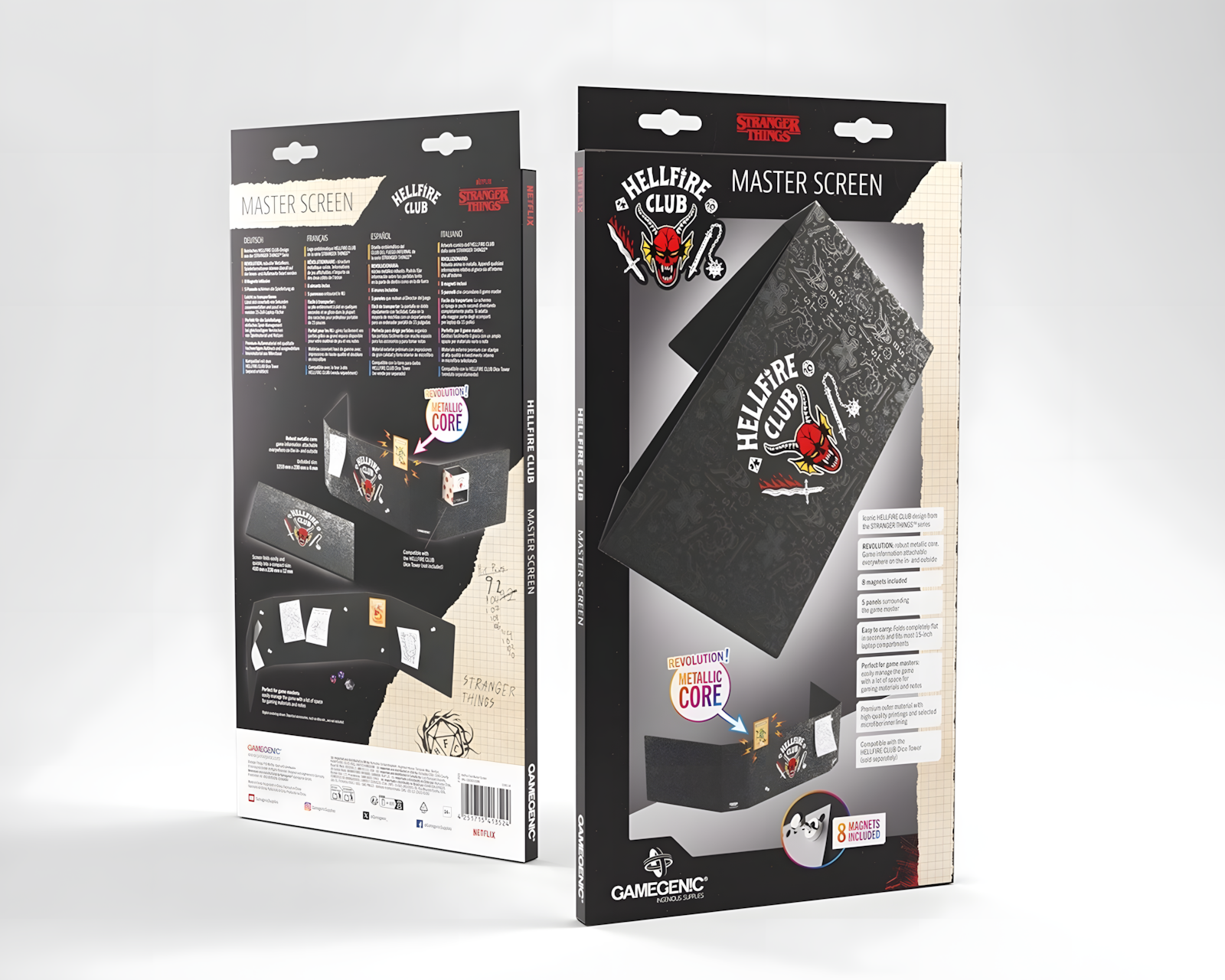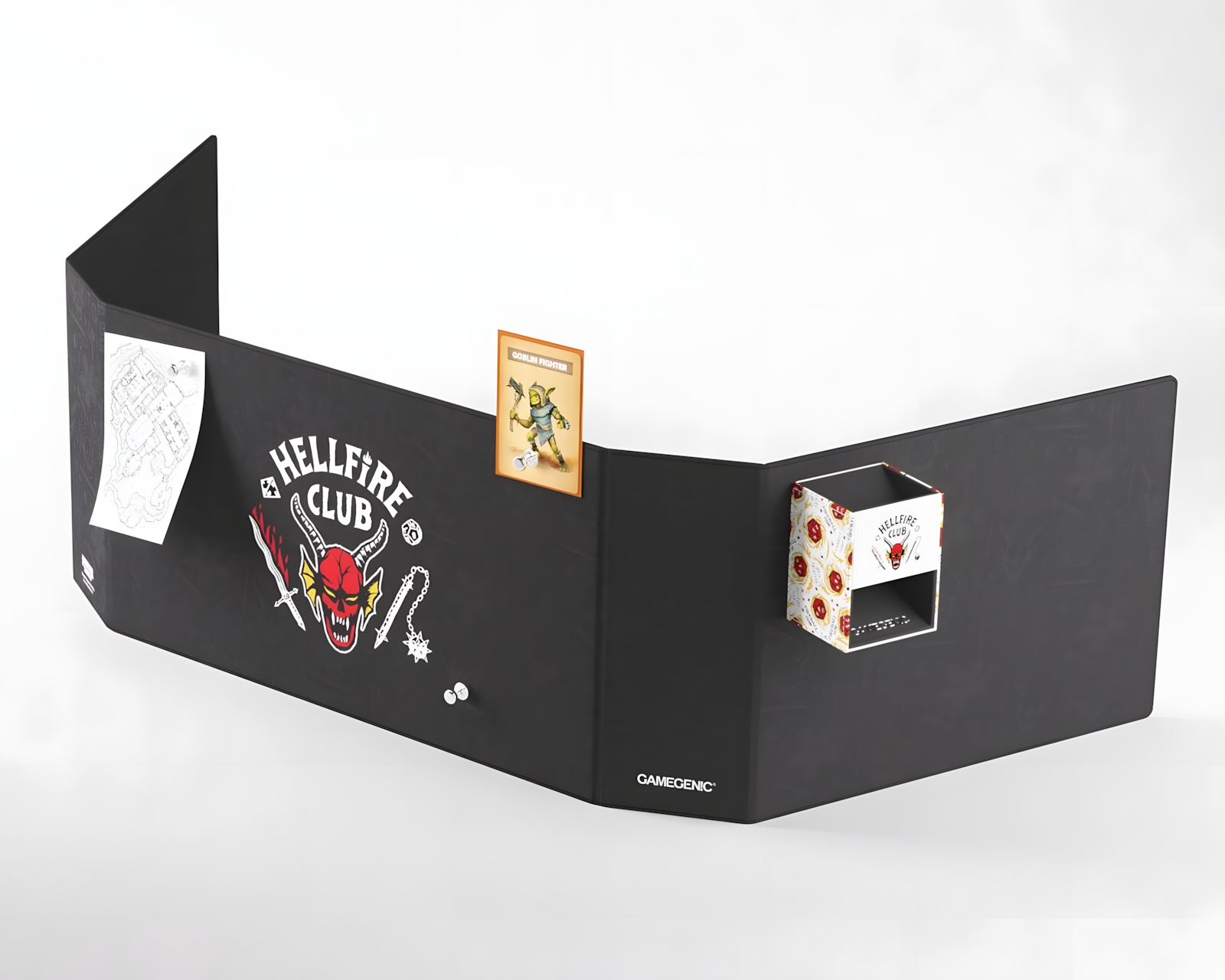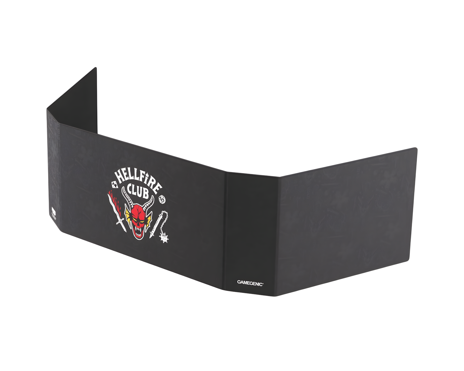 Hellfire Club Master Screen är en spelaccessoar från Stranger Things™-serien. Den har en ikonisk design och erbjuder en robust konstruktion med en metallisk kärna. Master Screen är utrustad med 8 magneter som kan fästa spelinformation både inuti och utanpå skärmen. Den är särskilt användbar för gamemaster som hanterar spelmaterial och anteckningar under spel.Skärmen är enkel att transportera, då den kan fällas helt platt på några sekunder och passar i de flesta 15-tums laptops. Produkten är tillverkad av Nexofyber+ yta och har en mikrofasertäckning invändigt. Detta resulterar i en slitstark och kvalitativ konstruktion. När skärmen är utfälld har den en storlek på 1210 x 230 x 4 mm och ger gott om utrymme för organisation av spelmaterial. Den kan användas tillsammans med HELLFIRE CLUB Dice Tower som säljs separat. Förpackningen är i en kartonglåda, vilket möjliggör skydd under transport.