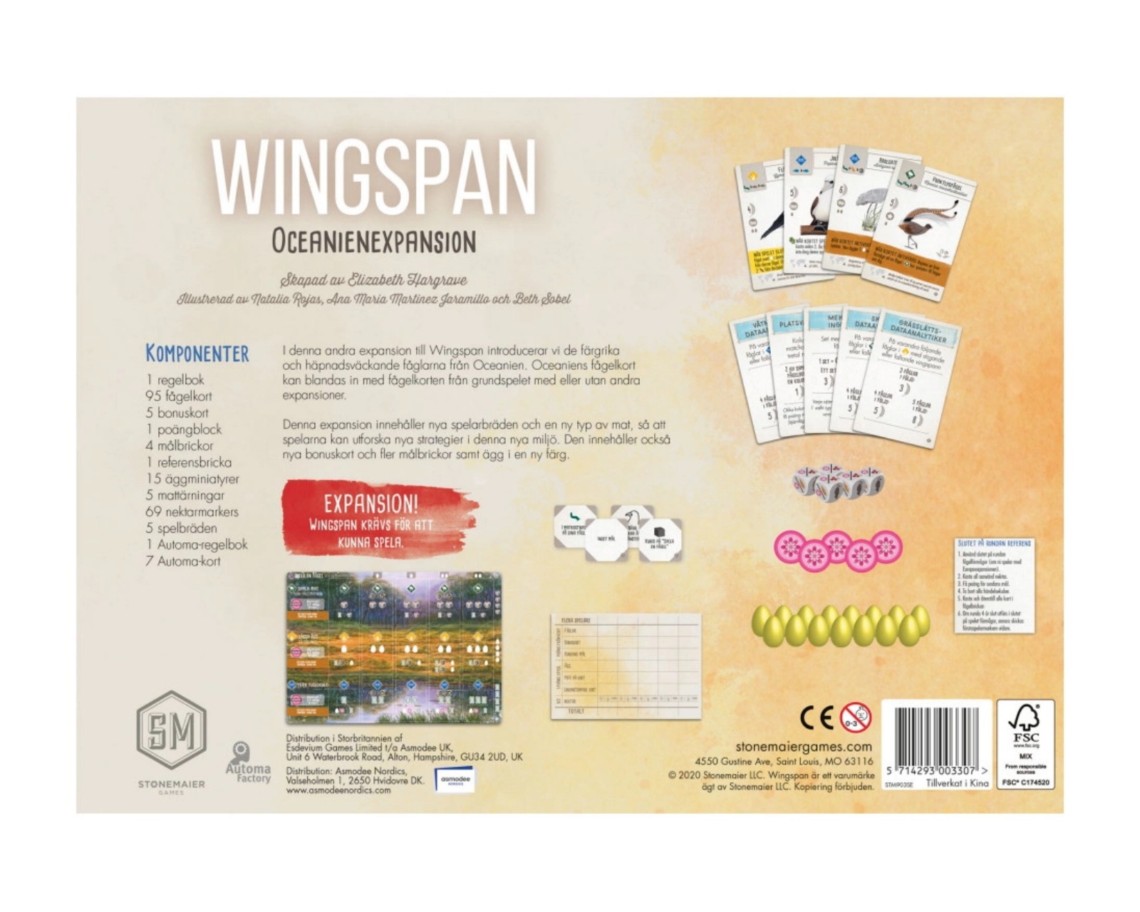Wingspan: Oceania Expansion är en expansion till Wingspan som fokuserar på fågelarter från Australien och Nya Zeeland. Den omfattar 95 fågelkort som kan blandas med korten från originalspelet. Expansionen inkluderar även nya bonuskort som erbjuder ytterligare strategiska alternativ för gamers. Materialen i expansionen är av hög kvalitet, med tydliga och färgglada illustrationer av fåglar, vilket bidrar till ett engagerande spelupplägg.I paketet ingår också 15 gula miniatyr ägg, 5 spelarbrickor och 5 trä tärningar, vilket ger en funktionell och äkta spelupplevelse. Nektarbrickor är en del av spelets mekanik, där 69 brickor finns med för att introducera nya spelstrategier. Denna expansion erbjuder variation och fördjupning för både nybörjare och erfarna gamers som vill utöka sina spelalternativ.