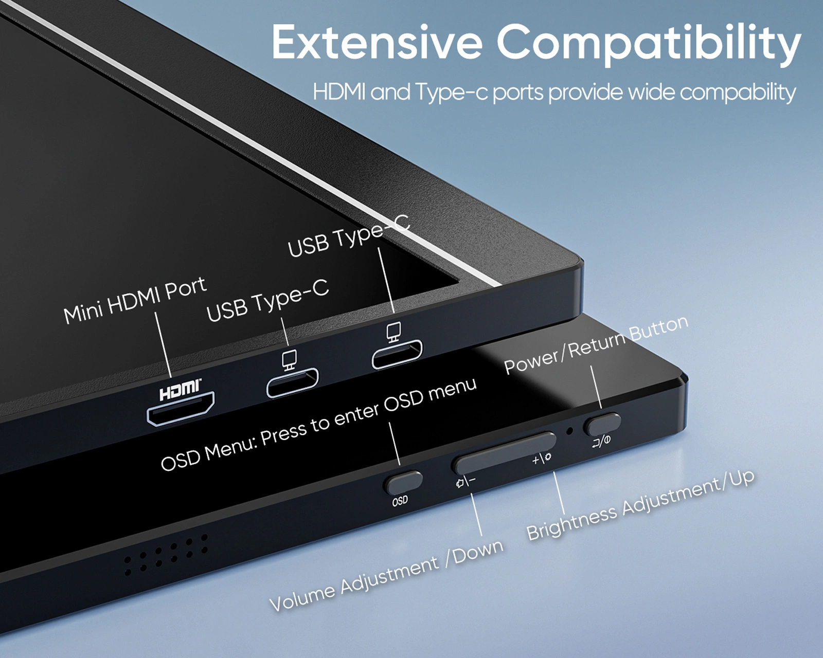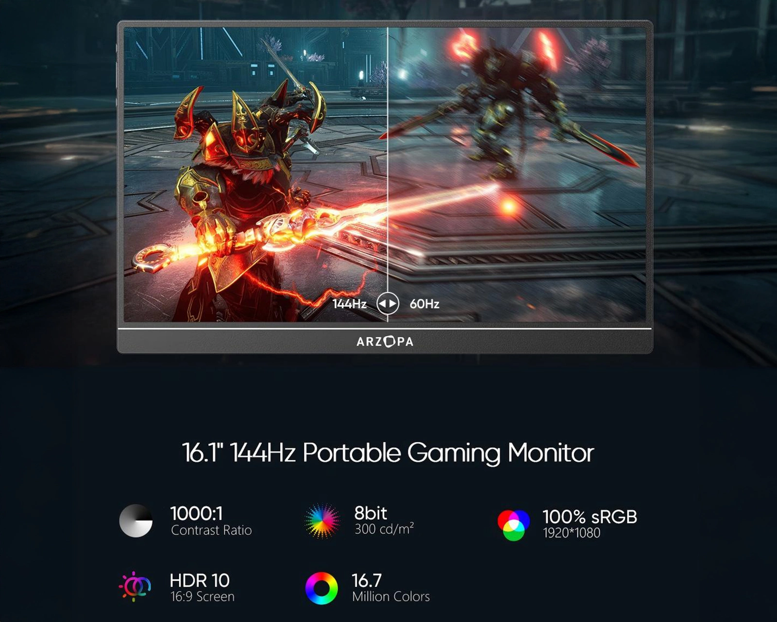 Z1FC 16.1" 144Hz är en bärbar skärm från Arzopa som erbjuder Full HD-upplösning på 1920x1080. Den har en IPS-display med uppdateringsfrekvens på 144Hz, vilket resulterar i snabb och smidig bildåtergivning. Produkten riktar sig till gamers och professionella användare som kräver extra skärmutrymme vid arbete eller spel.Enheten har en robust aluminiumkonstruktion som säkerställer hållbarhet och långvarig användning. Den är utrustad med en USB Type-C-port och en Mini-HDMI-port vilket möjliggör anslutningar till olika enheter. Med ett kontrastförhållande på 1200:1 och en ljusstyrka på 300 nits ger skärmen klara och färgstarka bilder. Skärmen har 100% sRGB färggamut vilket säkerställer hög färgnoggrannhet. En inbyggd kickstand gör det enkelt att justera skärmen till önskad vinkel. Funktionen för HDR-teknik ger förbättrad kontrast och mer dynamiskt omfång i bilder, vilket ytterligare förstärker användarupplevelsen.