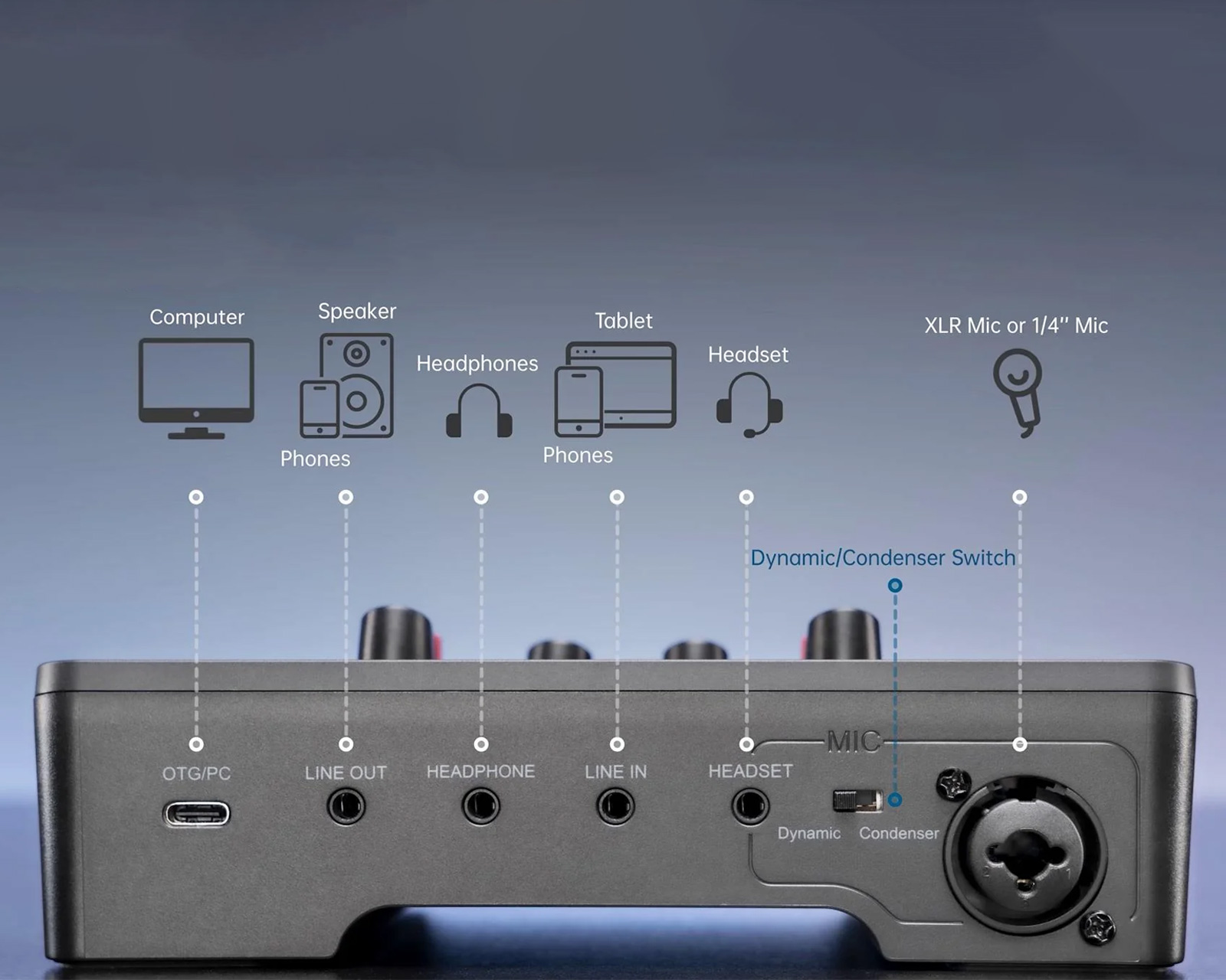 DEMO: Återköp och testexemplar. Bra skick.FiFine AmpliGame SC3 Audio Mixer är den ultimata lösningen för streaming, podcast och annan underhållning. Denna innovativa produkt ger en kraftfull 50 dB förstärkning för att öka prestandan hos olika XLR-mikrofoner, vilket möjliggör en högre nivå av kontroll över ljud inställningarna. Den enastående uteffekten driver HiFi hörlurar och skapar ett klart och fylligt ljud. Den strömlinjeformade anslutningsuppsättningen består av både line in och line out-port, samt en USB-C-kombo och USB-A-portar, vilket gör uppsättningen oslagbar.