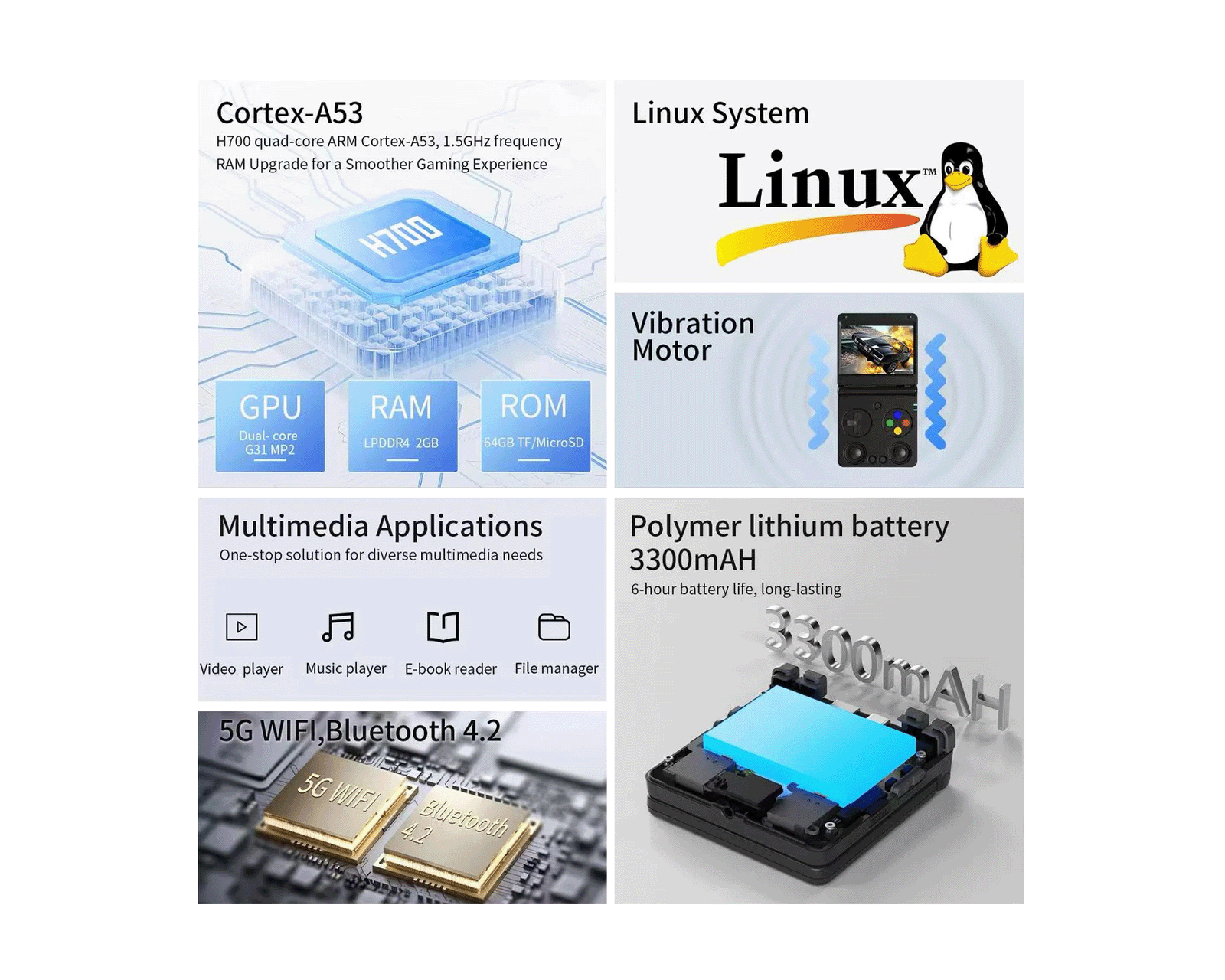 Konsolen stödjer upp till 14000 spel och inkluderar praktiska funktioner som multimediauppspelning, e-boksläsare och HD-anslutning till TV. Dessutom kommer den med ett högupplöst ljudsystem, inbyggd vibrationsmotor och trådlös kontrollermöjlighet (2,4 GHz och Bluetooth). Den smarta hall-magnetiska stängningsfunktionen erbjuder ett sleep-läge när locket stängs, vilket sparar batteri. Med en batteritid på upp till sex timmar och stöd för snabbladdning via USB-C är RG34XXSP perfekt för långa spelsessioner. Välj mellan flera snygga färgalternativ som gul, grå, svart och indigo.