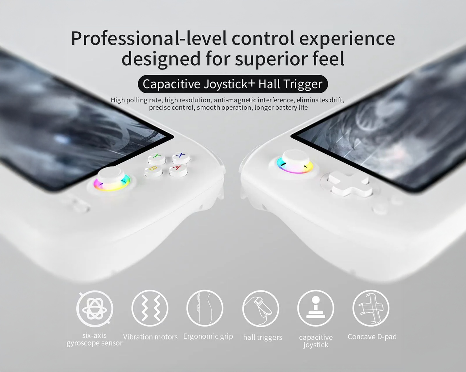 Denna konsol är utrustad med en åttakärnig processor och en Mali-G615-grafikprocessor, vilket ger snabb och smidig grafikrendering. Med 12 GB LPDDR5X RAM och 256 GB UFS 4.0 lagringsutrymme kan användare lagra fler än 8000 spel. RG557 kör Android 14 och stöder både WiFi 6E och Bluetooth 5.3 för stabil trådlös anslutning. En 5500 mAh polymer-lithiumbatteri ger cirka 8 timmars användning, och konsolen har en omfattande uppsättning portar inklusive USB Type-C och 3,5 mm ljudutgång för headset. Med RGB-ljuseffekter och en inbyggd sexaxlad gyroskopsensor erbjuder den också ytterligare funktionalitet för en mer dynamisk spelupplevelse.