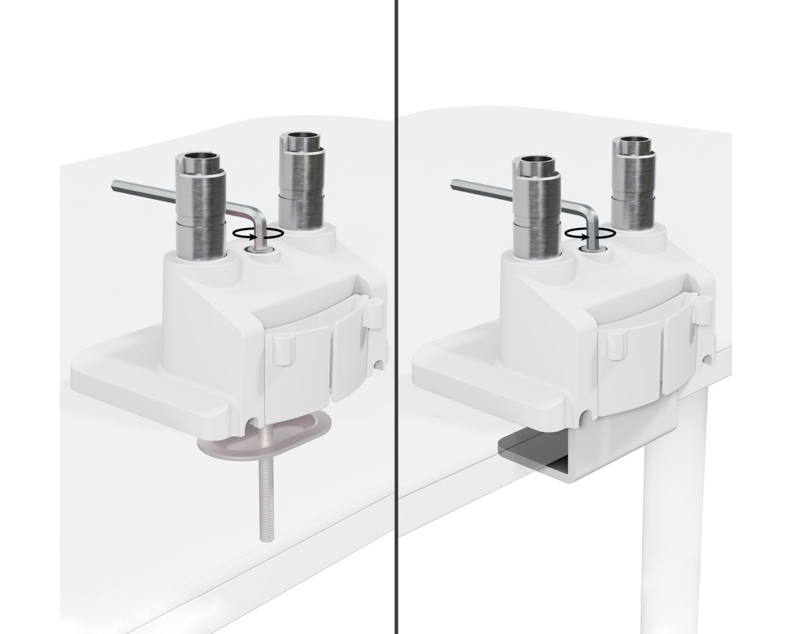 Skärmstativet är tillverkat av stål och erbjuder hög hållbarhet och stabilitet. Med möjligheter för lutning mellan +45° till -45° och ett svängområde på +90° till -90°, kan vinkeln på varje skärm justeras för att uppnå en ergonomiskt korrekt position. Rotationen sker i 360 grader, vilket ger stor flexibilitet vid användning. Montering sker med en klämma, vilket underlättar installationen på skrivbordet. Stativet har också inbyggd kabelhantering för att hålla arbetsområdet snyggt och fritt från sladdar.