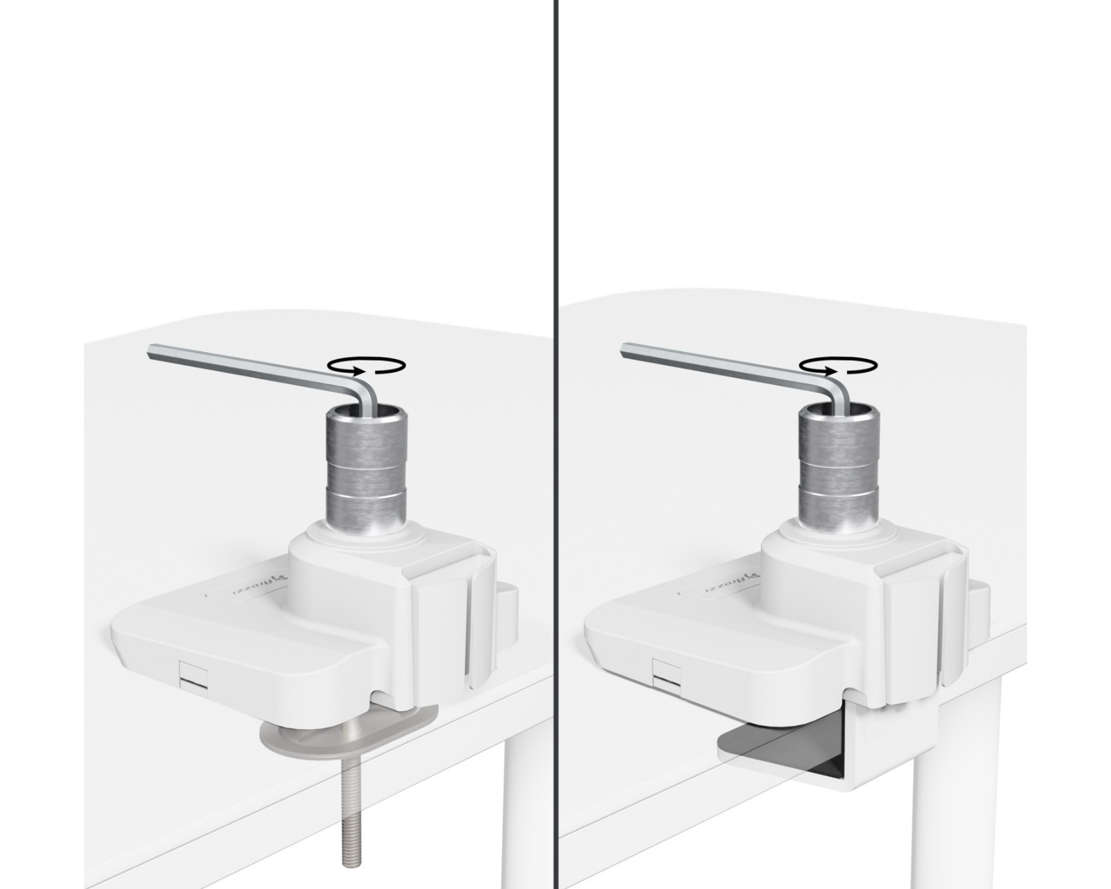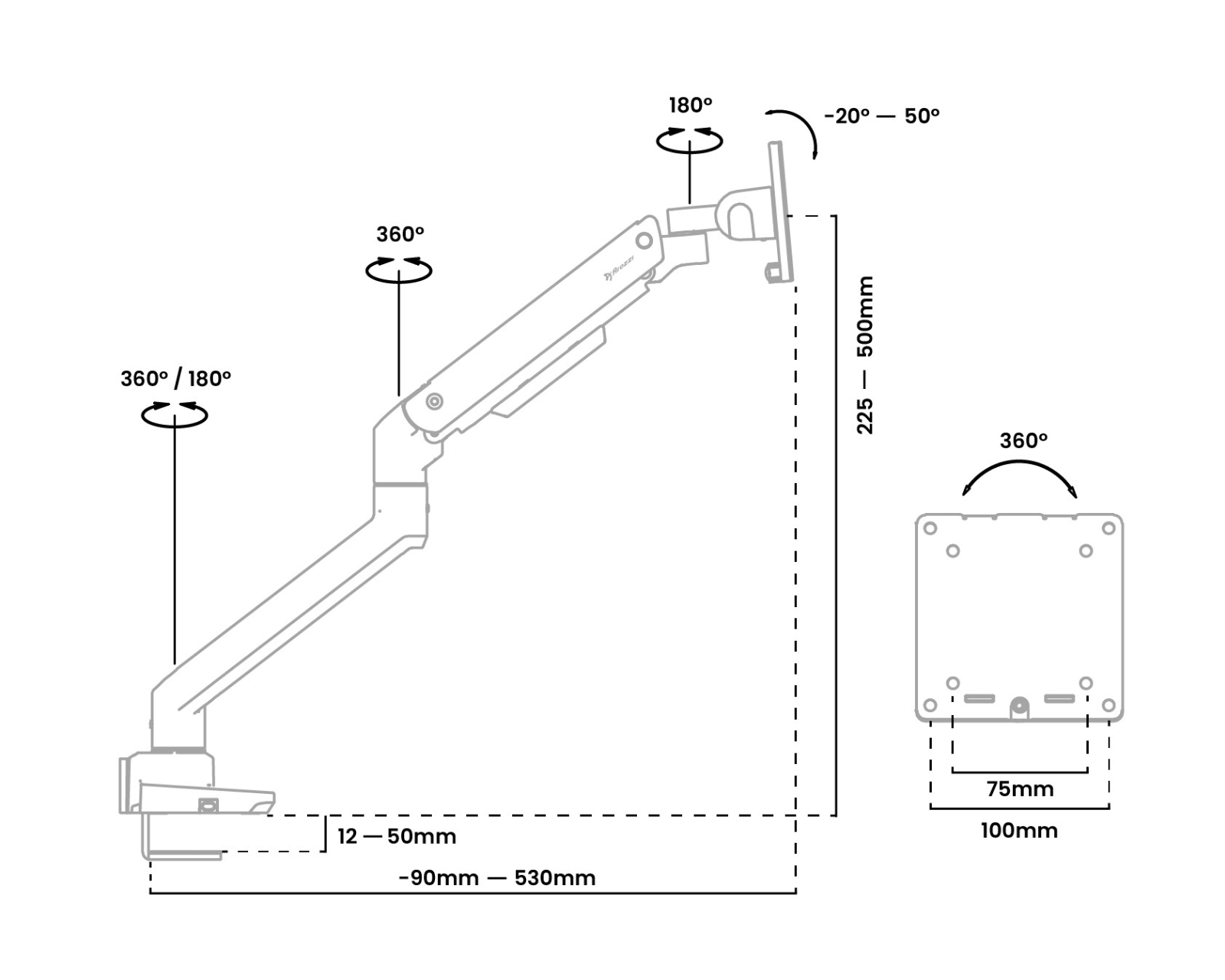 Stativet är tillverkat av stål, vilket säkerställer hållbarhet och stabilitet. Klämmonteringen gör det enkelt att installera skärmstativet på ett skrivbord utan att behöva använda skruvar. Med en lutning på +50° till -20° och ett svängområde på +90° till -90° kan användaren enkelt justera skärmen för optimal visning. Rotationsfunktionen på 360° ger ytterligare flexibilitet i placeringen av skärmen. Kabelhantering är även inkluderad, vilket bidrar till en välorganiserad arbetsyta.