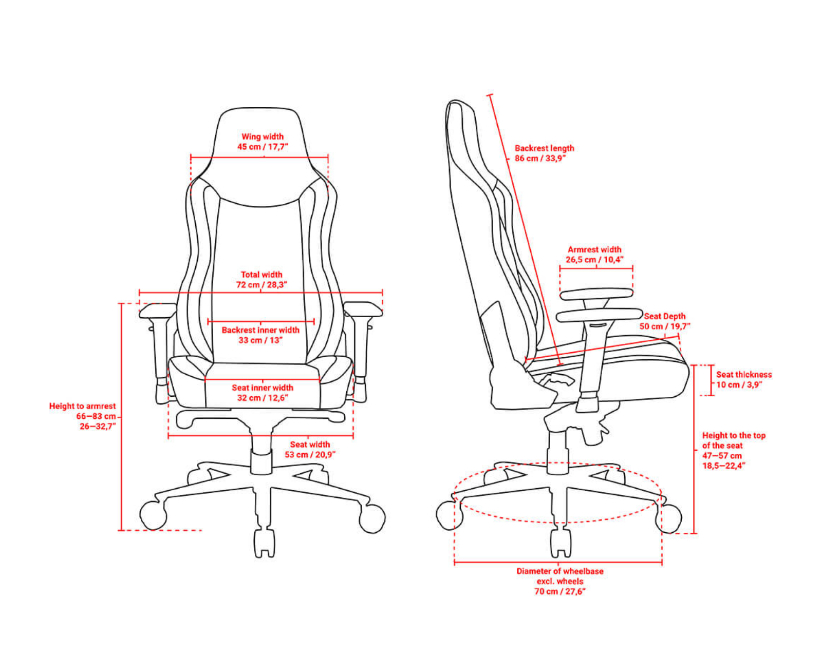 Den robusta metallramen säkerställer stabilitet och hållbarhet. Armstöden går att justera för att ge extra stöd och avlastning för armarna, medan de svängda kanterna på sitsen förbättrar sidostödet. Stolen har även en inbyggd svankstöd som bidrar till rätt hållning och ökar komforten ytterligare.