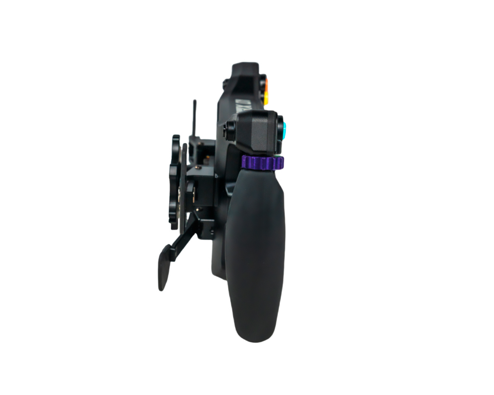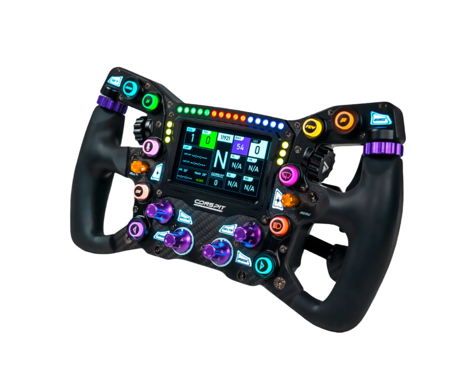 Hjulet är utrustat med tio RGB-knappar och åtta RGB-funktionslampor som kan anpassas efter behov. Dessa knappar har tydliga tryckpunkter och arbetar tillsammans med två ytterligare thumb-knappar och öppna thumb-encoders för flexibel kontroll. Det dubbel Hall-sensor-systemet för kopplingen och de tysta magnethastighetsreglagen gör växlingar precisionsfokuserade och ljudlösa, vilket är fördelaktigt under intensiva tävlingssituationer. Hjulet är konstruerat med fokus på högt vridmoment och kan klara av direktdrivsystem.