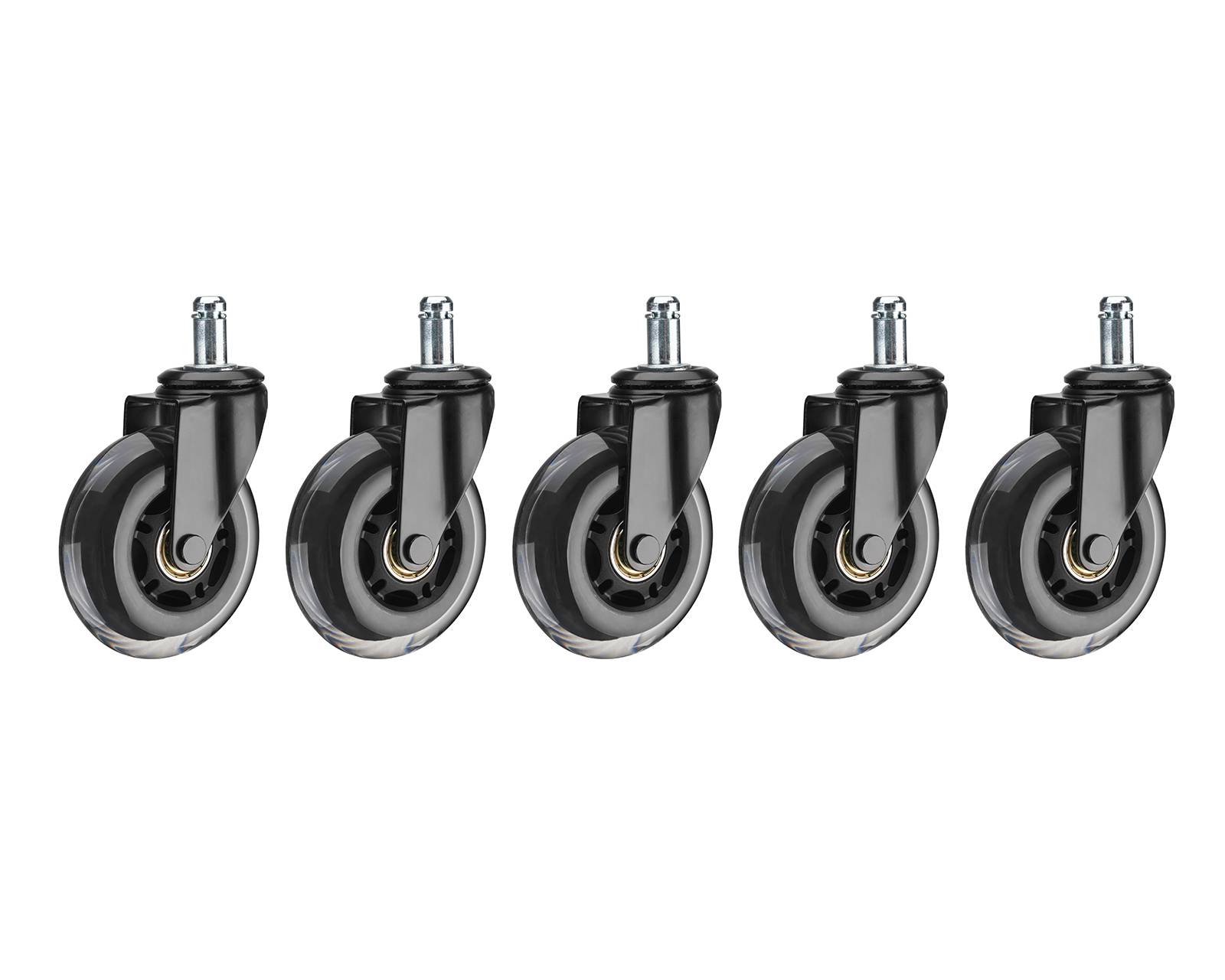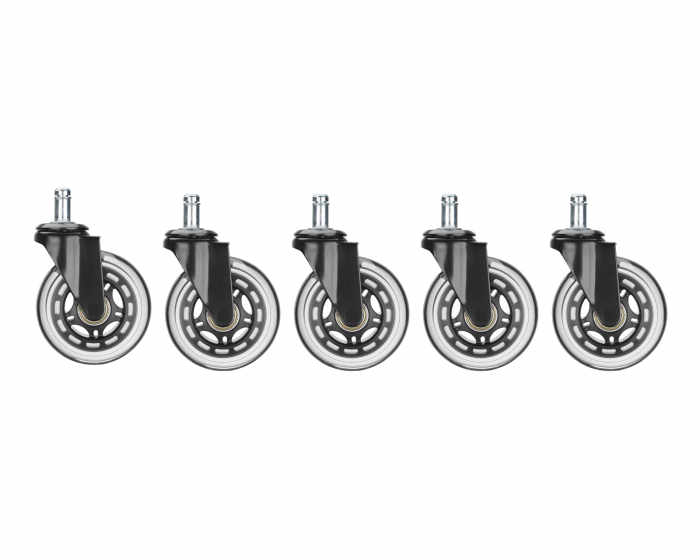 DEMO: Återköp och testexemplar. Bra skick.Nu kan du lätt och smidigt byta ut dina nuvarande stolshjul till dessa hjul till kontors- och gaming-stol som erbjuder smidig rull och är enkla att installera på stolen. Den universella fästtappen gör att stolshjul passar de allra flesta modeller. Hjulen är gjorda av robust stål och gummi, vilket bidrar till en lång hållbarhet. Känn dig säker på både trägolv och matta, stolshjulen ger en tyst rörelse och ett bra grepp. 3-Tums diameter (7,62cm) bidrar till en ökad stabilitet. Paketet innehåller 5 st stolshjul.