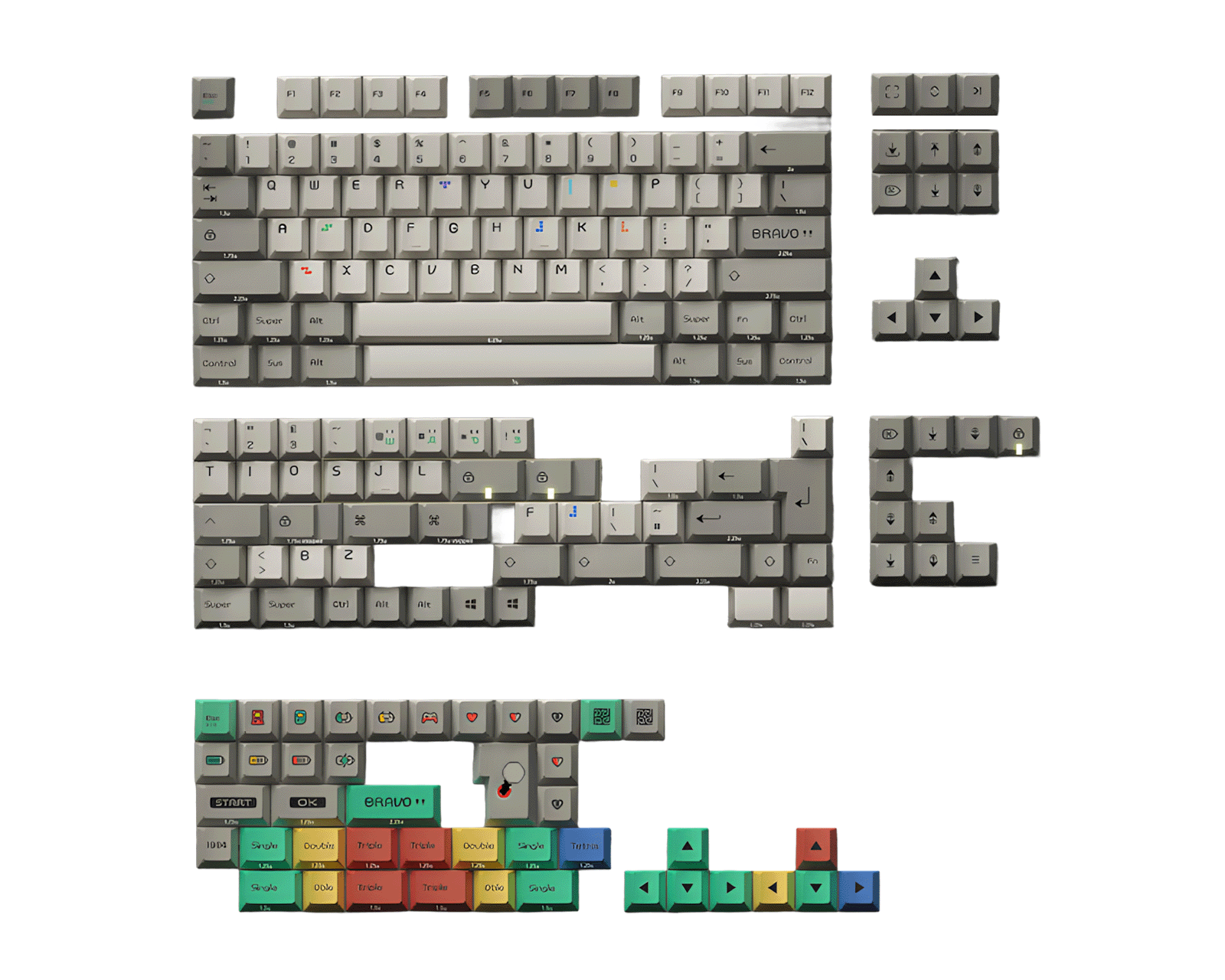 Designen av dessa keycaps kännetecknas av lågmättade färger som beige och grå, accentuerat med en blågrön nyans som påminner om äldre monitorskärmar. För att förstärka den retro känslan har fonterna redesignats och pixeliserats, vilket ger en autentisk känsla av retro-gaming. Keycapsen är av Cherry-profil och passar Cherry MX-switchar samt MX-stil kloner, vilket gör dem kompatibla med ett brett utbud av tangentbord. Tillverkningsmetoden som använts är dye-sub, vilket ytterligare bidrar till hållbarheten och färgens livslängd. Införandet av en designad ABS-tray förpackning gör det enkelt att förvara keycapsen säkert.