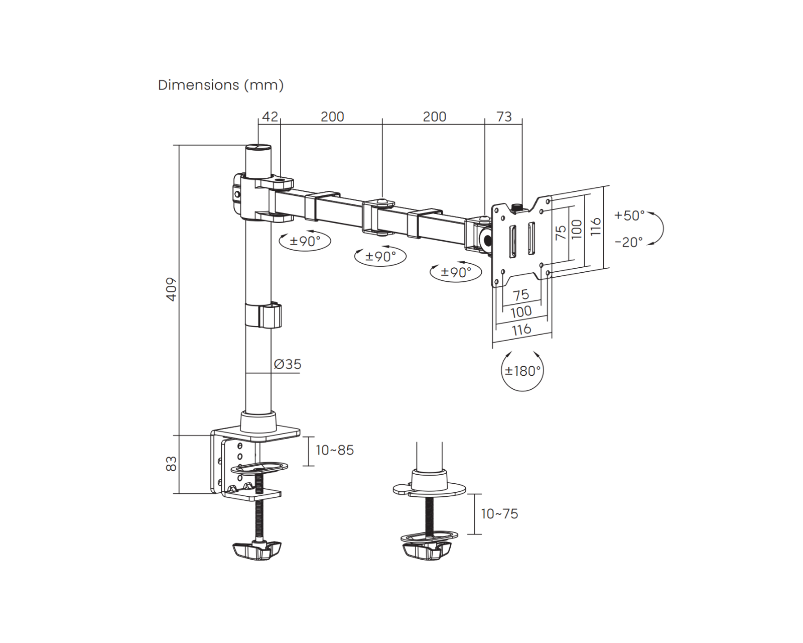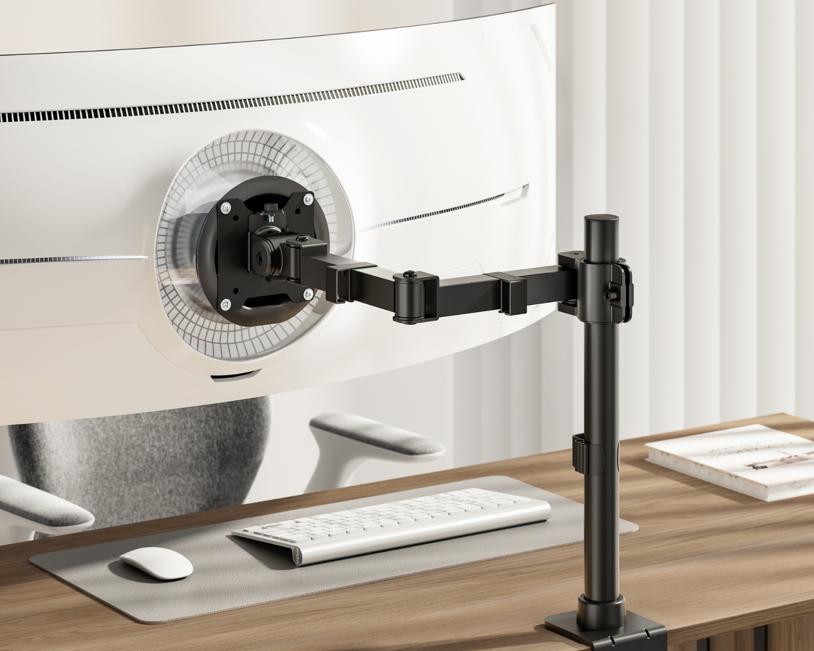 Monitorarmen är tillverkad av robusta material som säkerställer långvarig hållbarhet och pålitlighet. Den fria höjdjusteringen gör det enkelt att anpassa positionen för att optimera arbetsmiljön. Svängbarheten ger flera visningsvinklar och den 360° roterbara VESA-plattan möjliggör ytterligare anpassning. Tillämpningen av en fri-lutande design gör att användaren kan anpassa vinkeln efter behov.