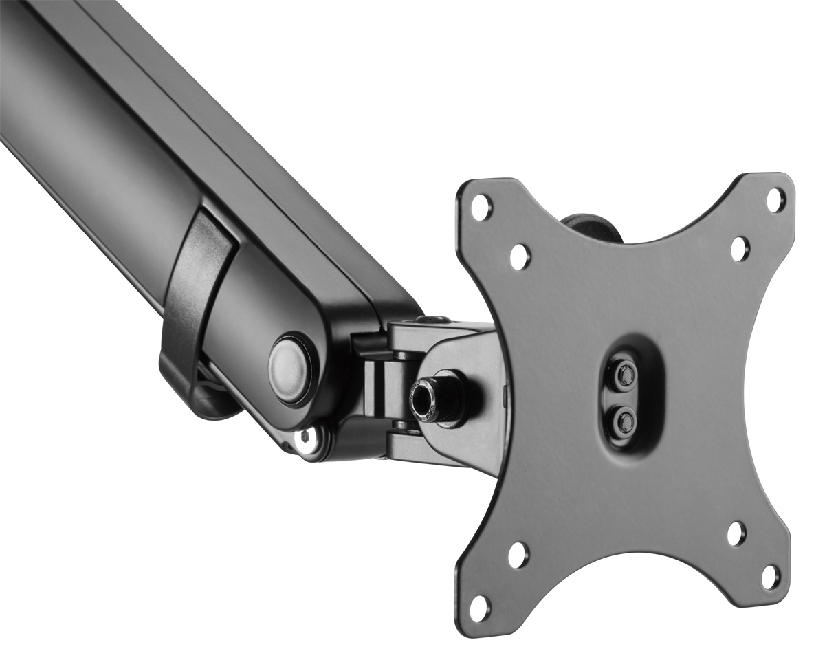 Slipp hålla upp skärmen och skruva fast den samtidigt! Detta skärmstativet kommer med ett avtagbart VESA-fäste, vilket gör att kan du montera plattan direkt på skärmen och sedan enkelt klicka fast den på stativet. Stativet kommer också med två olika klämmor, en C-klämma som monteras fast på sidan av bordet och en som skruvas igenom bordet.