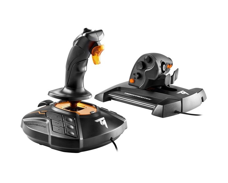 T.16000M FCS har fyra fristående axlar, inklusive vridbart roder (som styrs genom att vrida på spaken), 16 actionknappar med blindskriftsliknande, fysisk knappidentifiering, en åttavägs PoV-hattknapp, samt en ergonomisk avtryckare. Dess slående orangea betoning och bakgrundsbelysning tar spelarnas inlevelse till en helt ny nivå.