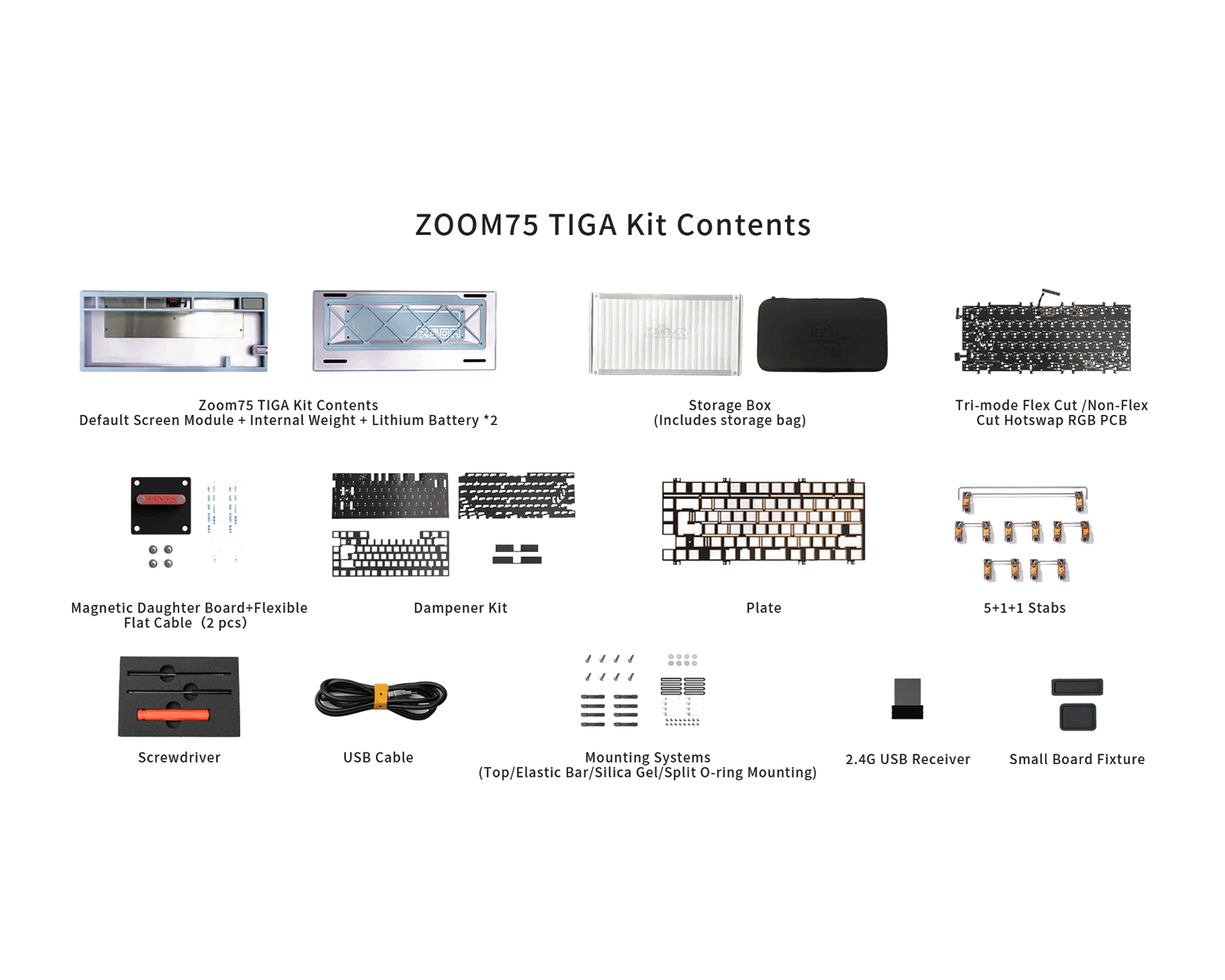Med modern LED-teknik, justerbar skärm och anpassningsbara detaljer som dubbla vingpaneler är Zoom75 TIGA både funktionellt och estetiskt. Med tri-mode-anslutning och förbättrat batteri på 8000 mAh är detta tangentbord skräddarsytt för både prestanda och stil.