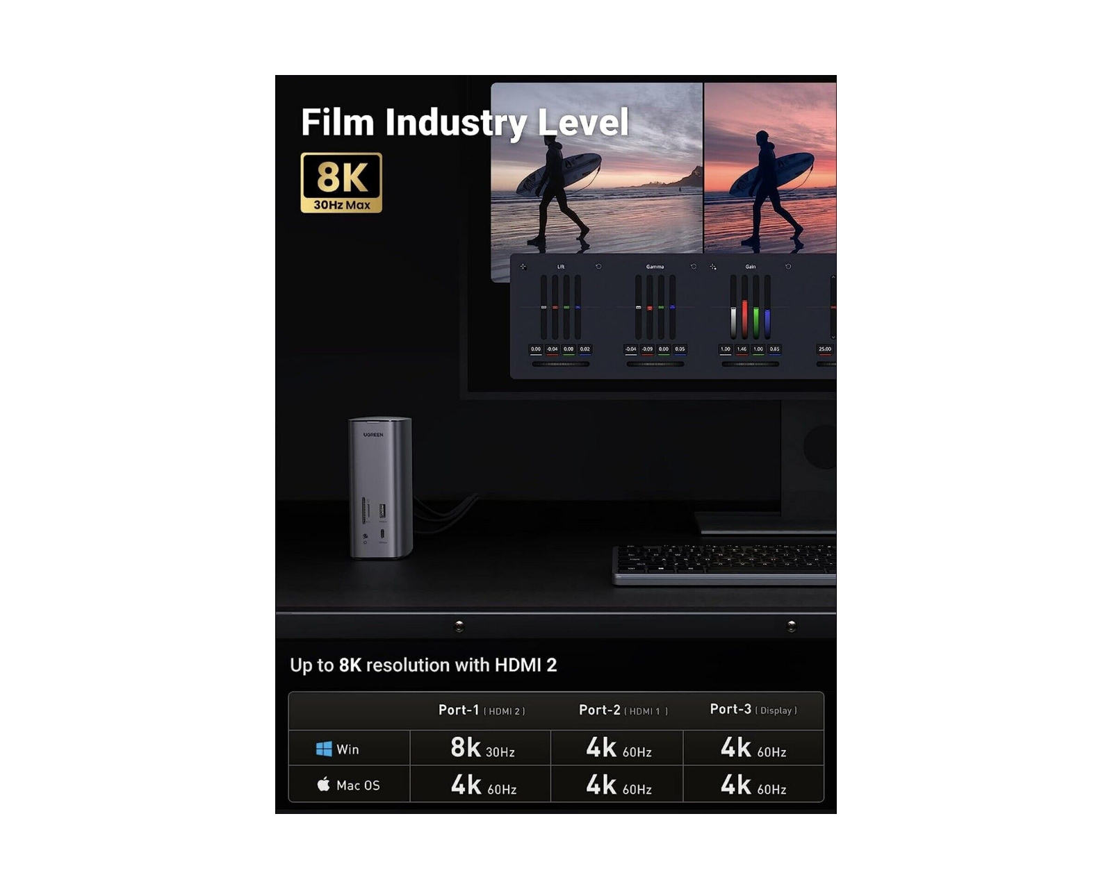 Dessutom inkluderar dockningsstationen en HDMI-port som också stöder 4K vid 60Hz och en andra HDMI-port med kapacitet för 8K vid 30Hz, vilket innebär att du kan ansluta flera skärmar med hög upplösning. En USB-C PD-port möjliggör snabb laddning av dina enheter, medan en RJ45-port med 1000Mbps ger stabil och snabb internetanslutning.