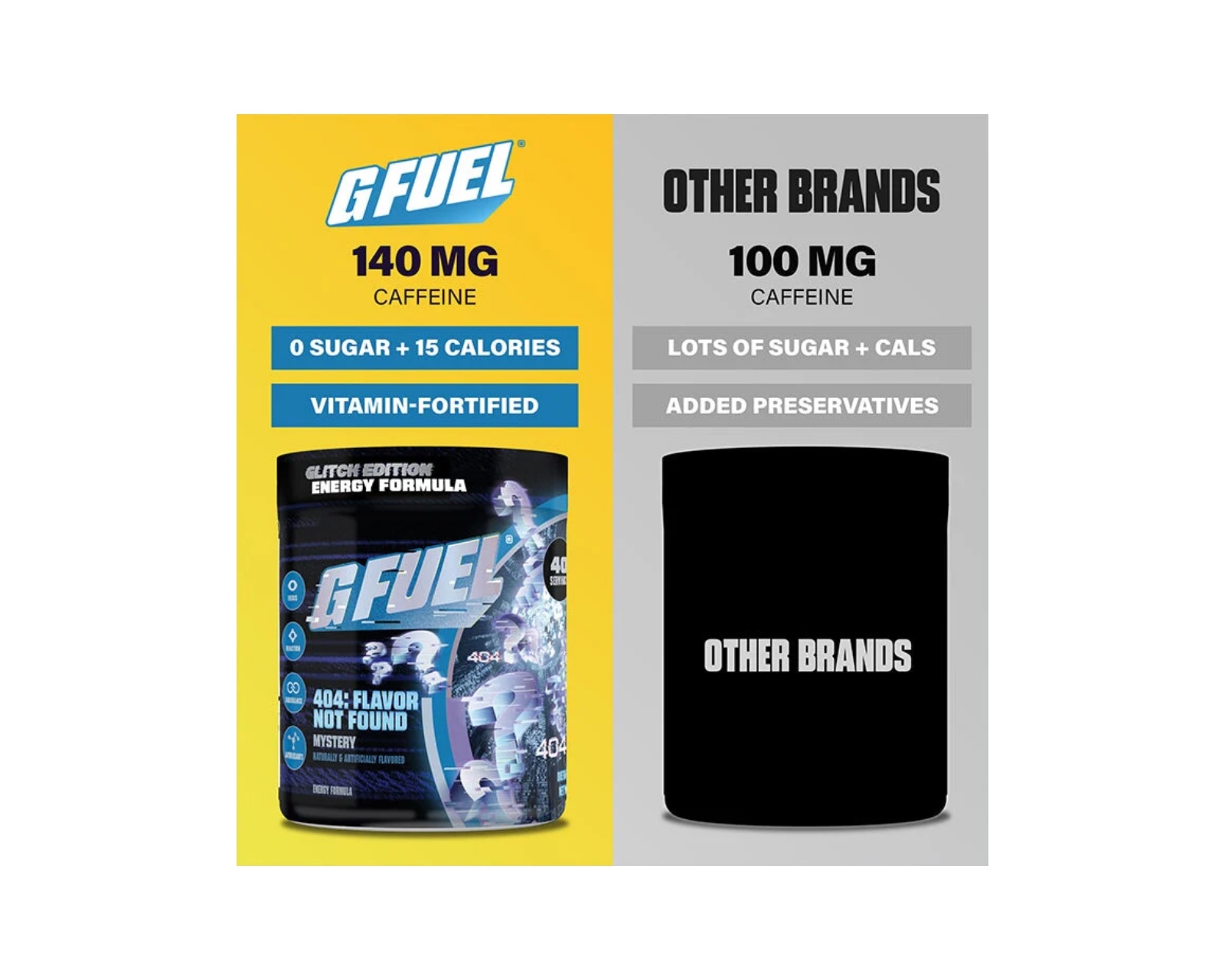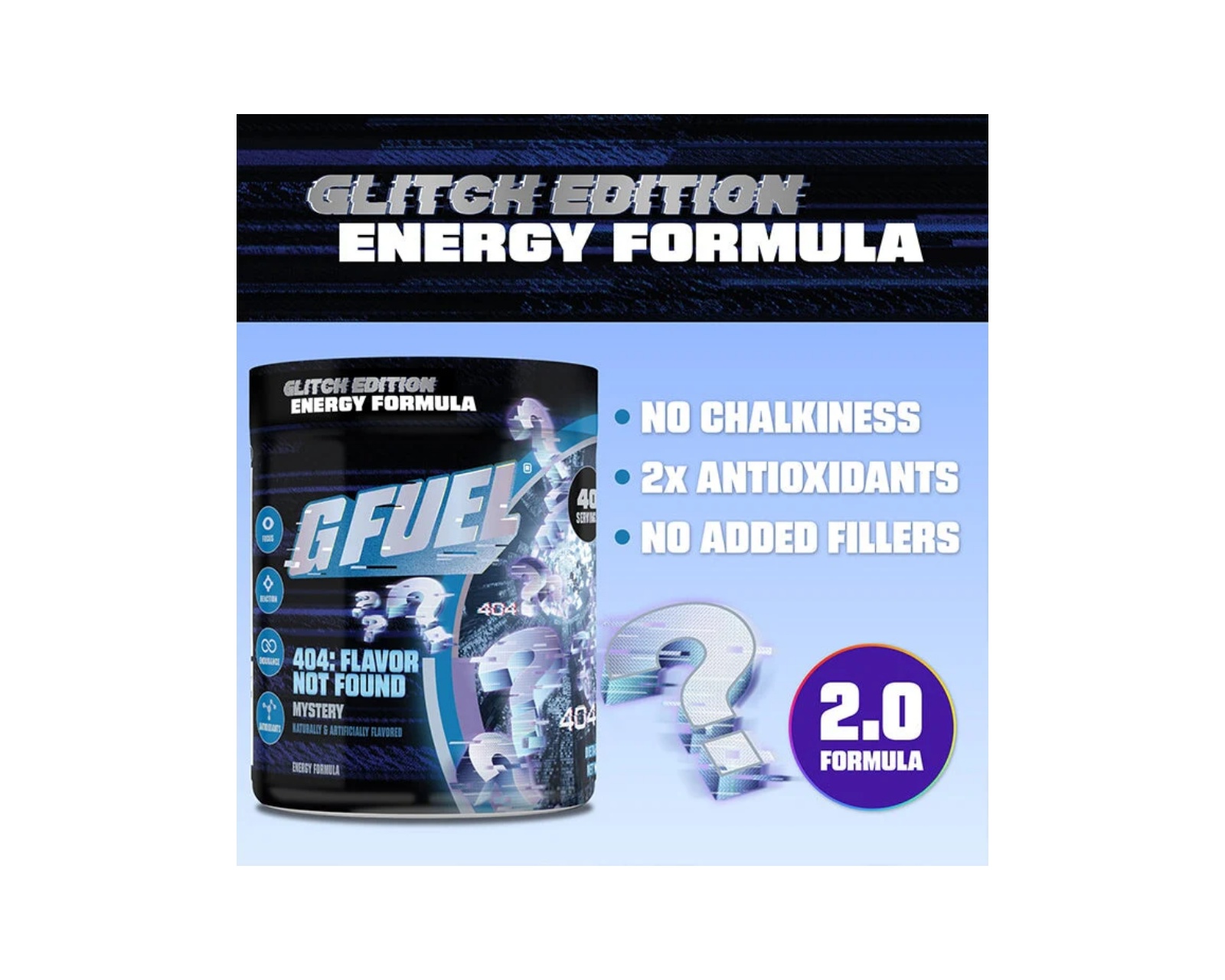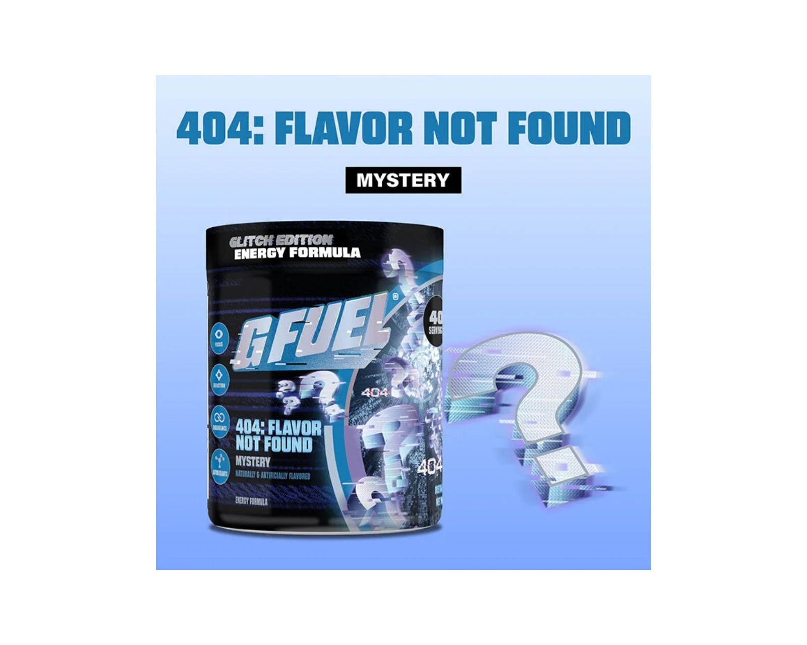 404: Flavor Not Found från G FUEL som erbjuder högkvalitativ prestationsstöd med 140 mg koffein per portion och 40 portioner per tub. Produkten är fri från tillsatt socker, vilket gör den till ett lämpligt alternativ för den som vill ha en sockerfri energikälla.Denna produkt är utformad för den som söker ett energitillskott med fokus på prestanda och koncentration. Med en instegsnivå av 140 mg koffein kan användaren snabbt återfå fokus och energi med endast en skopa. Den är dessutom utrustad med en episk glittrande förpackning som ger en modern känsla.