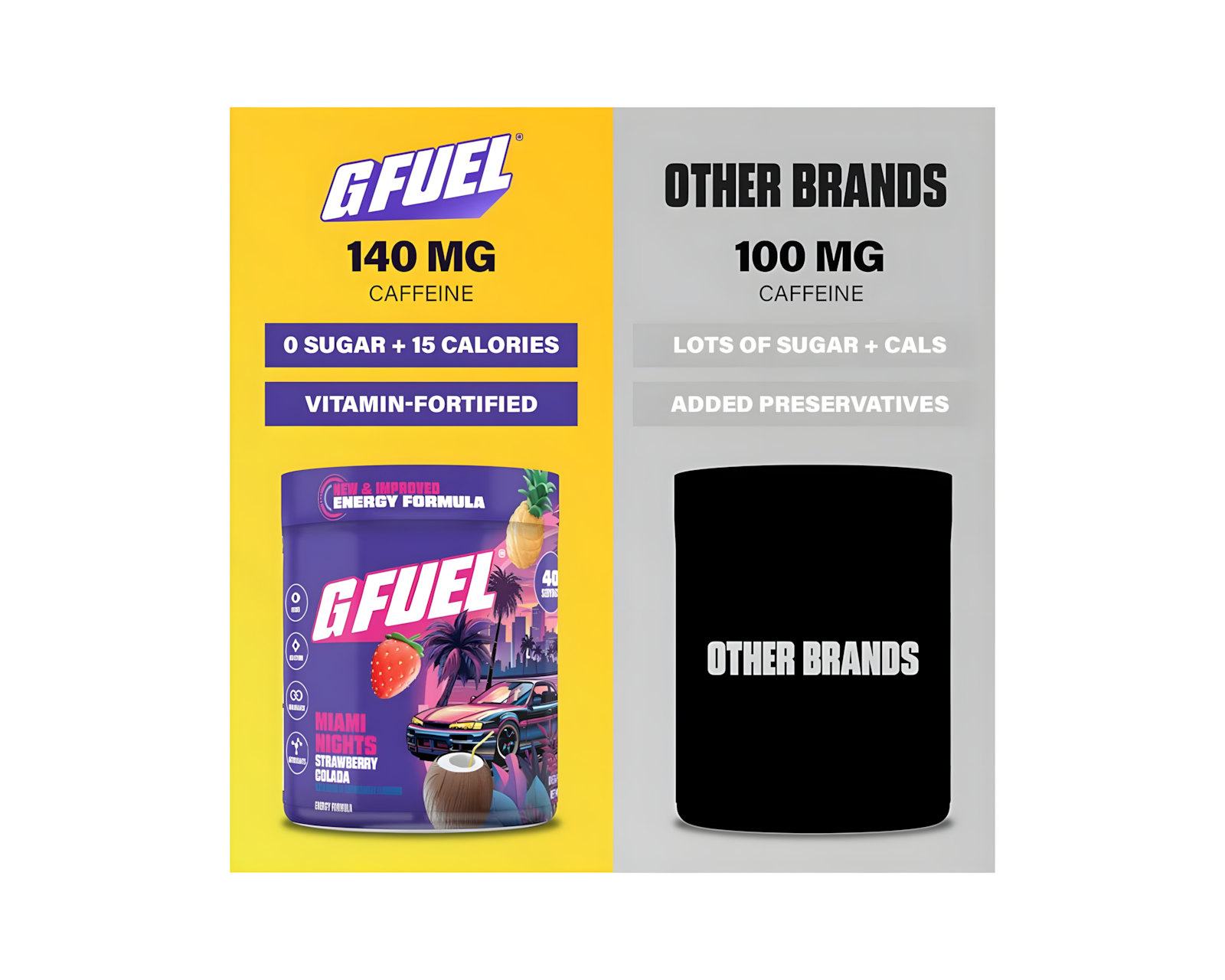 Miami Nights 2.0 från G FUEL som kombinerar en saftig mix av smak profil inspirerad av Miami Vice med funktionalitet, vilket gör den idealisk för den aktiva livsstilen. Med en smak som är en blandning av jordgubbar, kokos och ananas erbjuder den en uppfriskande dryck för dem som vill hålla sig alerta, vare sig det är i spelet, vid poolen eller på gatan. Varje servering innehåller 140 mg koffein för ökad energi och fokus, samtidigt som den är fri från tillsatt socker för en hälsosammare val.Produkten är skapad med tanke på både smak och funktion, vilket gör den lämplig för spelare och aktiva individer som vill ha en energikick utan onödiga tillsatser. Den knappa kalorimängden och avsaknaden av socker gör den till ett utmärkt alternativ för den hälsomedvetne. G FUEL:s expertis inom kosttillskott säkerställer att varje portion ger en stabil energikälla under hela dagen. Energin som frigörs från koffeinet hjälper till att förbättra fokus och reaktionstid, vilket är avgörande i både gaming och vardagliga aktiviteter.