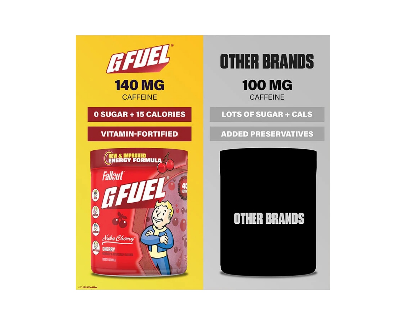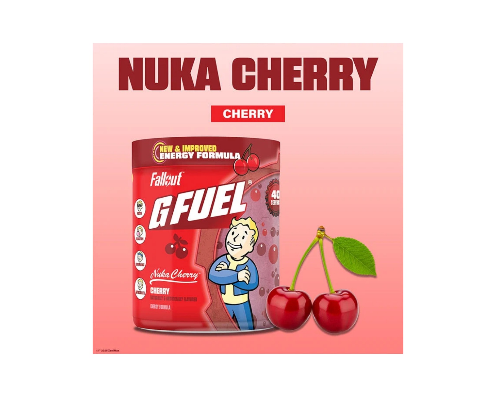 Nuka Cherry från G FUEL som erbjuder en unik smak av körsbär. Produkten innehåller 40 portioner med 140 mg koffein per servering. Drycken är sockerfri och fri från onödiga fyllnadsämnen.En energidryck som Nuka Cherry är designad för att maximera fokus och uthållighet i spel och andra aktiviteter. Med den förbättrade formeln 2.0 inkluderar denna dryck antioxidanter och ingredienser som stödjer både kropp och sinne för att klara post-apokalyptiska utmaningar.