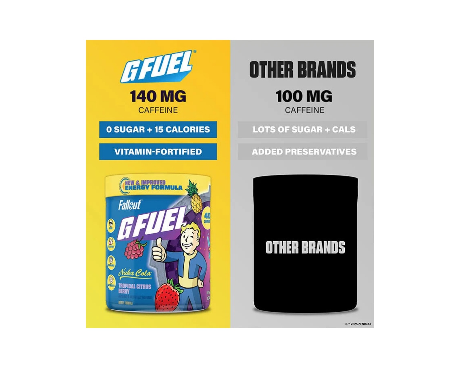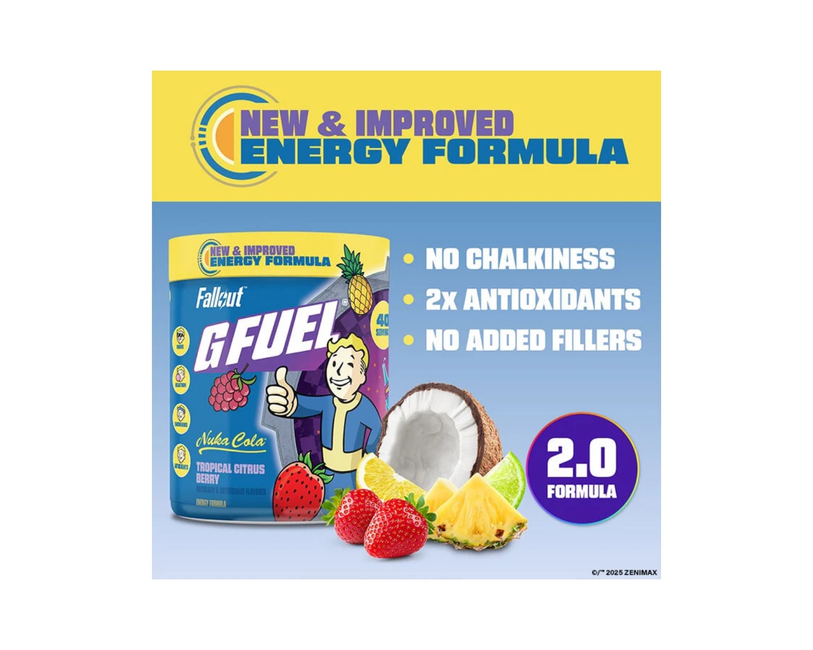 Nuka Cola 2.0 från G FUEL som kombinerar smak av iste och citronad. Innehåller 40 portioner med 140 mg koffein per servering. Drycken har ingen tillsatt socker vilket gör den till ett alternativ utan onödiga kalorier.Produkten är utvecklad för att ge ren och pålitlig energi utan krascher. Den är perfekt för den som söker ett energitillskott utan socker. Fisktens lågkaloriinnehåll, på upp till 10 kalorier per portion, gör den till ett lämpligt val för såväl gamers som aktiva individer.