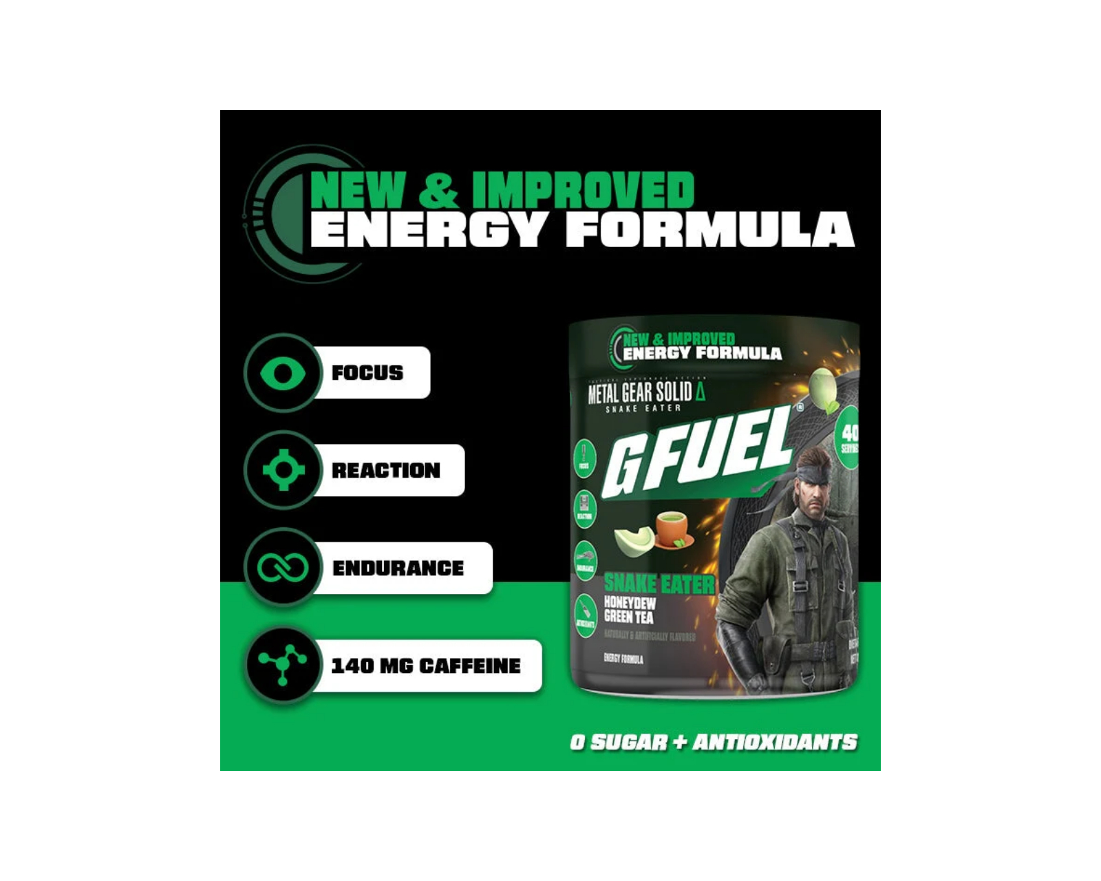 Snake Eater från G FUEL som kombinerar en uppfriskande smak av Honeydew green tea. Den erbjuder 40 portioner och har en koffeinhalt på 140 mg per servering, vilket ger det stöd du behöver för att klara av intensiva pass.Produkten är designad för att ge en stabil energikick utan tillsatt socker, vilket avser att stödja både koncentration och uthållighet. Med en smakprofil som kombinerar sötman från citronade med en subtil ton av iste, är den utformad för att ge en fräsch och uppiggande upplevelse.