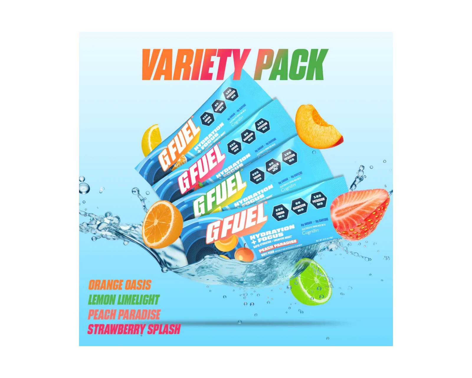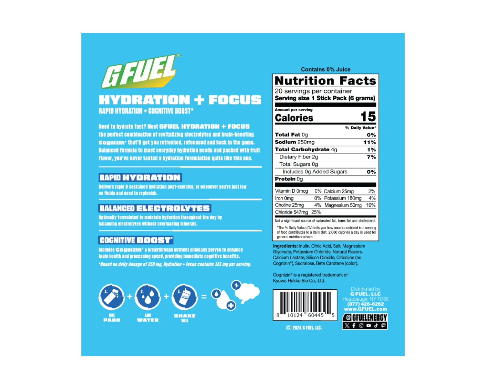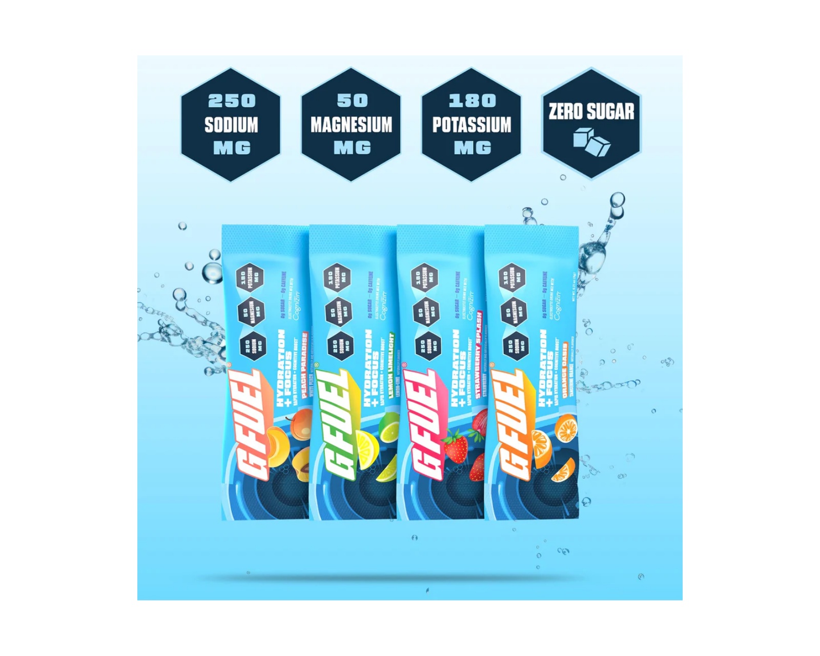 Variation paket Hydration + Focus Pack är ett elektrolytpulver från G FUEL, som erbjuder snabb återhydrering och stöd för mental fokus. Det innehåller en blandning av fem viktiga elektrolyter med specifikationen 250 mg natrium, 50 mg magnesium och 180 mg kalium per portion. Produkten är avsedd för gamers, atleter och yrkesverksamma som kräver både fysisk och mental prestation.Den noggrant utformade formeln av elektrolytpulvret inkluderar också Cognizin, en kliniskt studerad nootropisk substans som främjar hjärnfunktion och mental klarhet. Pulvret är sockerfritt och har bara 15 kalorier per portion, vilket möjliggör en ren hydratiseringsupplevelse utan en salty eftertaste. Hydration + Focus Pack levereras i fyra smaker: citron, persika, jordgubbe och apelsin. Varje portionsförpackning blandas enkelt med vatten, vilket gör den perfekt för träning, resor eller intensiva arbetsdagar.