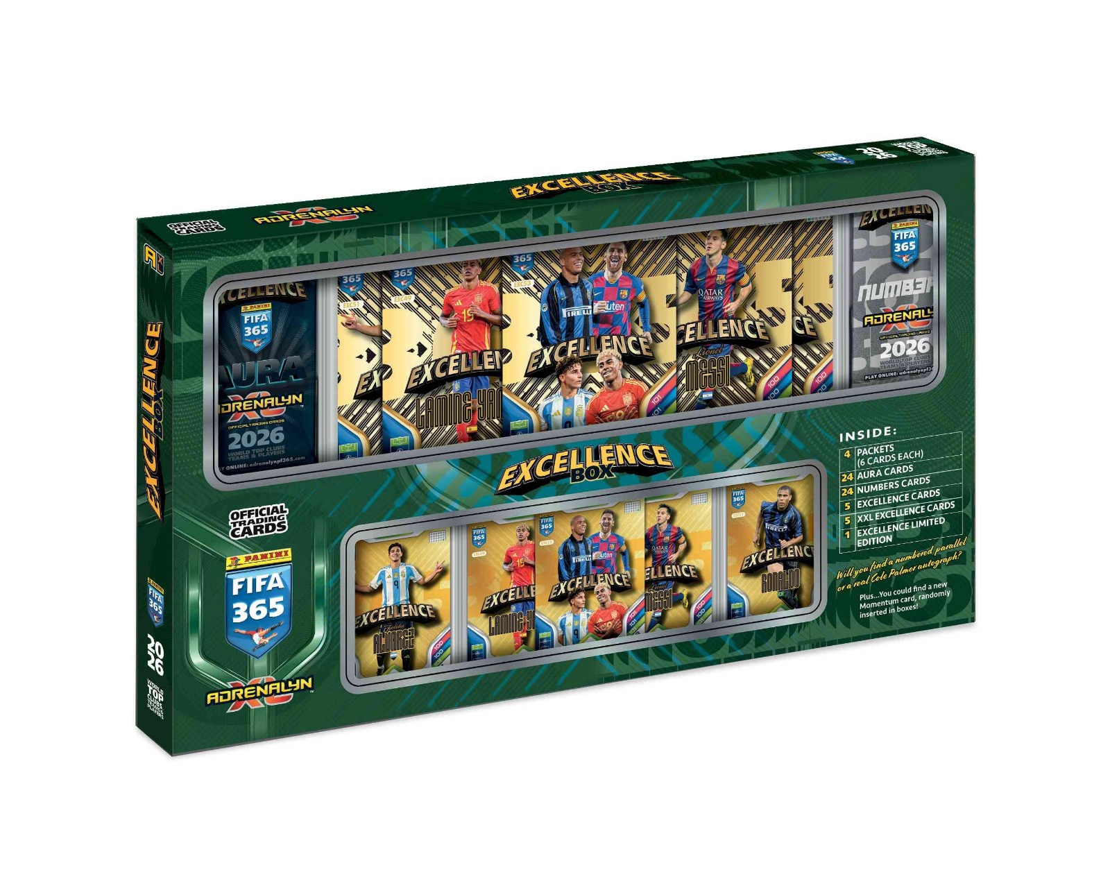 FIFA 365 Adrenalyn XL 2026 Excellence Box är en samlarbox från Panini som innehåller kort relaterade till fotboll, inklusive olika kändisar och lag. Denna box är designad för samlare och fotbollsälskare som vill utöka sina kortsamlingar med en mix av specialkort och vanliga kort. Huvudkomponenterna inkluderar 82 kort som är fördelade i 4 exklusiva boosterpack med Aura-kort, 4 exklusiva boosterpack med Numbers-kort, 4 vanliga boosterpack och flera Excellence-kort.Boxen erbjuder flera specialmaterial och underkategorier som ökar samlarvärdet, inklusive Limited Edition-kort, parallella kort och kort med äkta autograf. Korten är också numrerade för ökad unikhet. Varje boosterpack innehåller 6 kort vilket sammanlagt ger 24 Aura-kort och 24 Numbers-kort. Dessutom ingår 5 exklusiva Excellence-kort och 5 XXL Excellence-kort för dem som letar efter något extra.