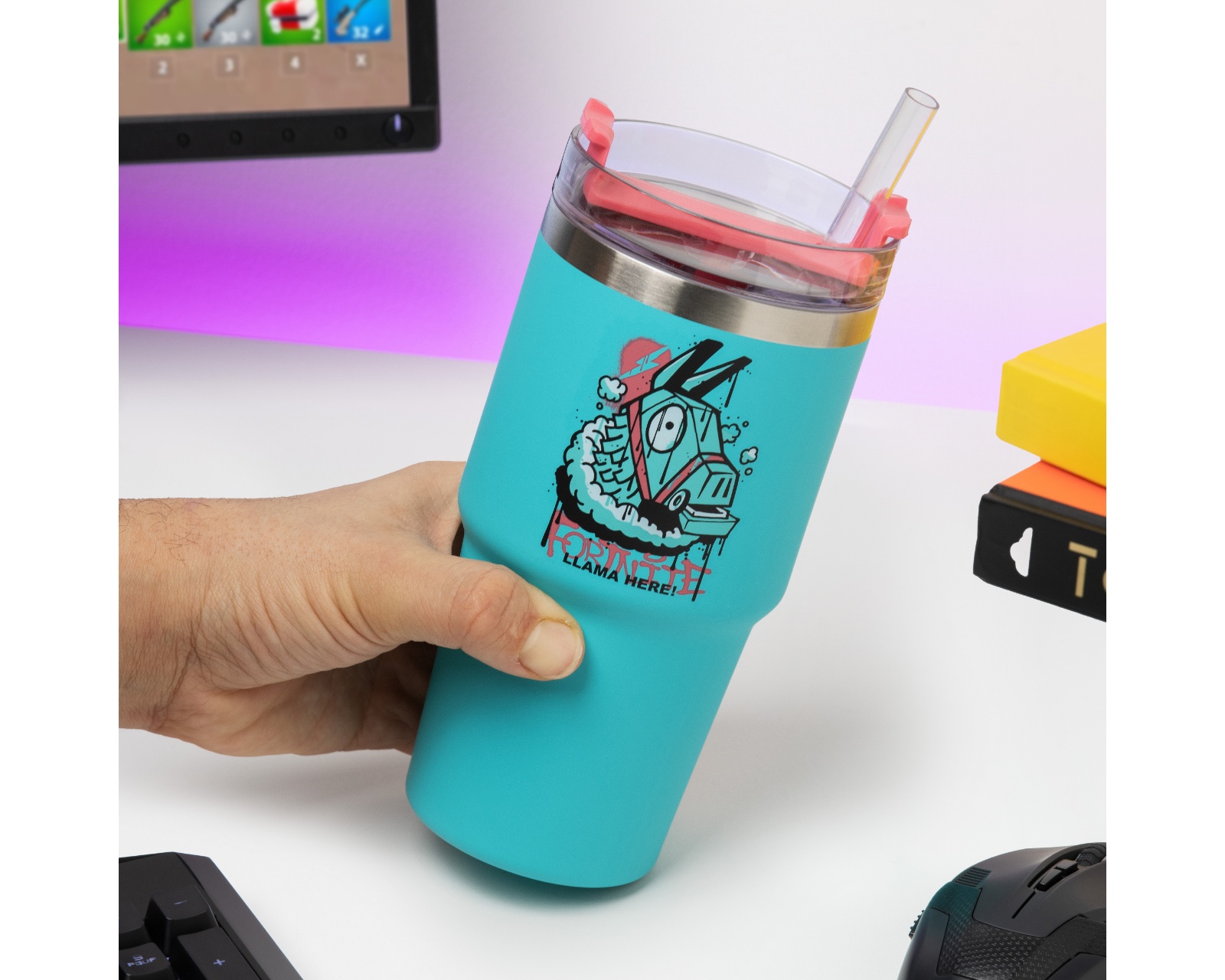 Håll dig uppfriskad under dina spelsessioner med Fortnite Gamer Cup. Denna stilrena blå isolerade mugg på 600 ml håller dina drycker kalla eller varma i flera timmar, oavsett om du tar en paus eller spelar non-stop. Med sin mjuka yta och smidiga design passar den lika bra för hemmet som för resan. Den smala basen gör att den enkelt får plats i vanliga mugghållare.Lockets smarta 3-i-1 funktion erbjuder ett strålöppning för sugrör, en bekväm sipplösning och en stängd topplock. Ta enkelt med din favoritdryck och gör spelstunden ännu bättre. Handdisk rekommenderas.
