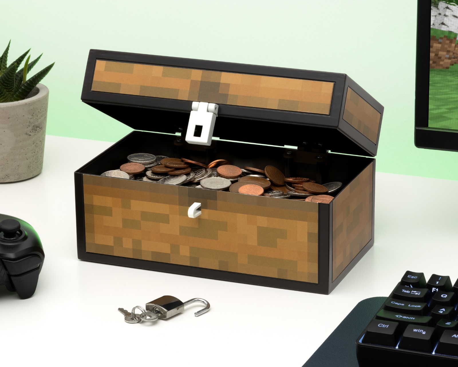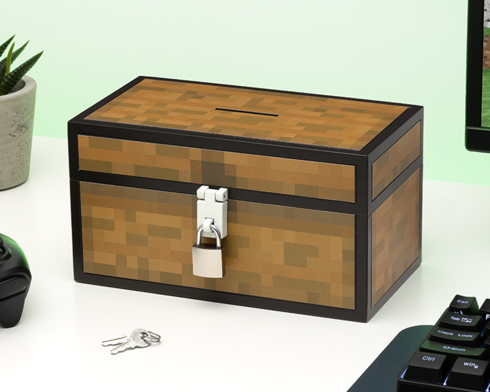 Minecraft Chest Money Box är en spargris inspirerad av det populära spelet Minecraft. Den har en höjd av 12 cm och är tillverkad av plast, vilket gör den lätt och hållbar. Med en medföljande lås kan du säkra dina fickpengar som i en egen valv i Overworld. Den är idealisk för block-byggare och hantverksmästare som vill spara till nästa äventyr.Produkten är designad med en uppsättning specifikationer som gör den lättanvänd och funktionell. Den har en vikten 0.3 kg, vilket gör den portabel och lätt att hantera. Den mångsidiga konstruktionen gör att den kan användas av både barn och vuxna, vilket bidrar till dess breda attraktionskraft.