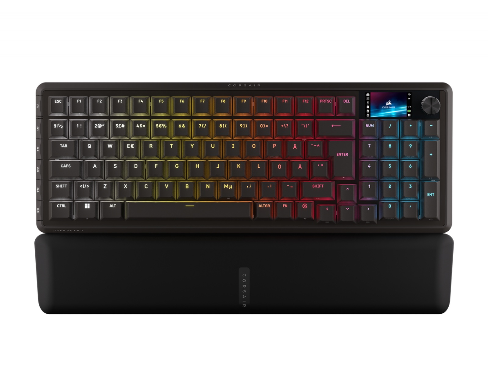 Vanguard 96 är ett 96% fullstort gamingtangentbord från Corsair som erbjuder en balanserad design med piltangenter och numeriskt tangentbord. Med en integrerad LCD-skärm och en praktisk ratt för justering, ger detta tangentbord en användarvänlig och funktionell upplevelse. Det är konstruerat för gamers som värdesätter både prestanda och flexibilitet, medan det erbjuder ett komprimerat format liknande TKL-tangentbord.Byggkvaliteten hos Vanguard 96 är tydlig med sin robusta konstruktion och användning av högkvalitativa material. Tangentbordet stödjer Elgato Virtual Stream Deck-integration, vilket möjliggör sömlös kontrollering av dina streamningar eller applikationer. Med 8 kHz trådlös hyper-polling och FlashTap SOCD-hantering, avsevärt reduceras latens och maximalt utnyttjar tangentbordets responsivitet. Dessutom ger CORSAIR Web Hub webbaserad anpassning, vilket gör det möjligt för användare att skräddarsy tangentbordet efter sina specifika behov.