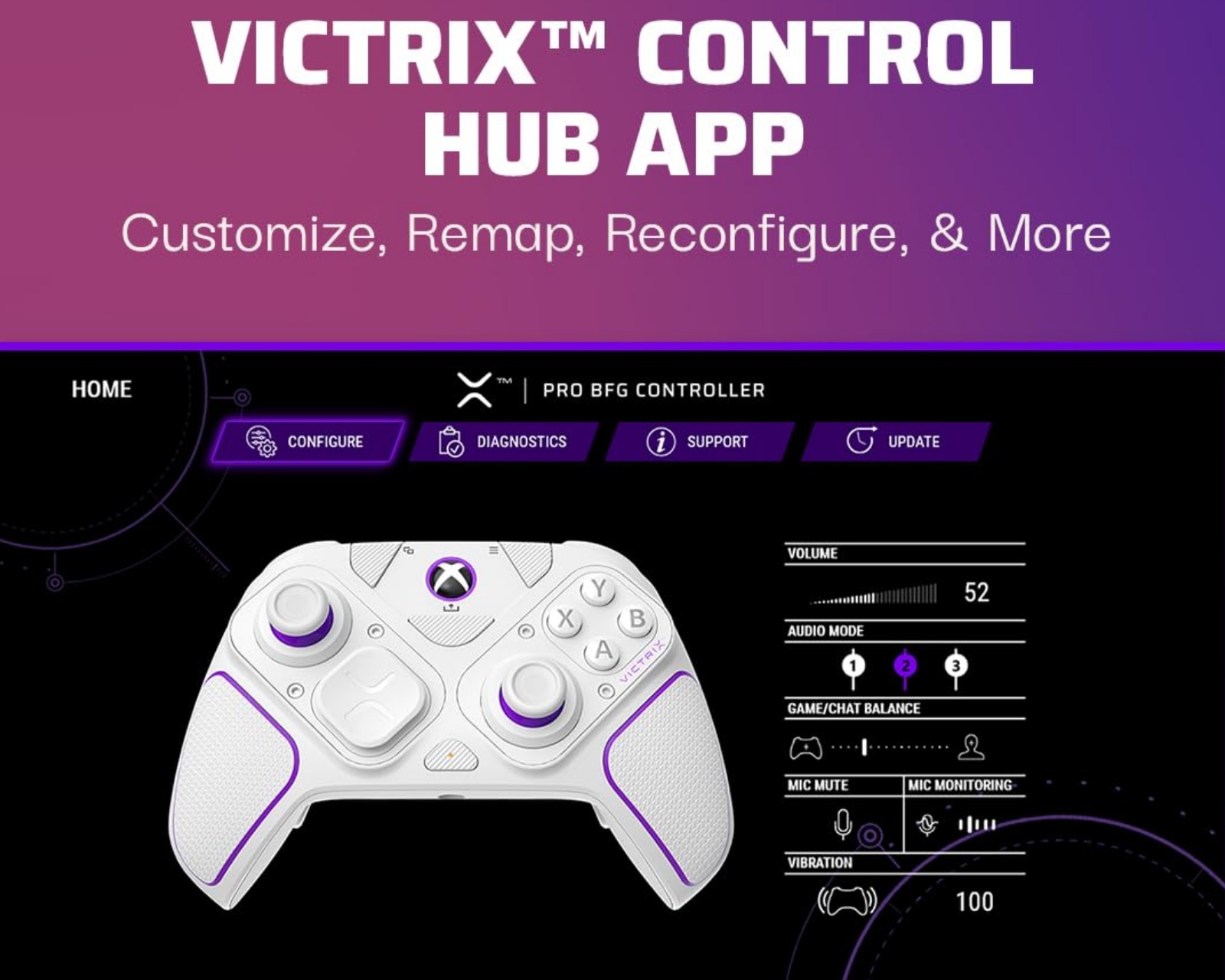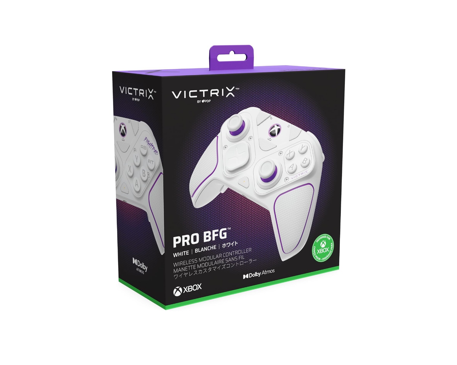 Victrix Pro BFG-kontroller är en handkontroll från PDP som erbjuder avancerade anpassningsmöjligheter och hög precision. Den är kompatibel med Xbox Series X, Xbox Series S, Xbox One samt Windows 10/11. Den kan användas trådlöst via USB-dongel eller Bluetooth, eller kopplas in med den medföljande kabeln för turneringsspel och snabbare ingång.Den modulära designen tillåter användaren att konfigurera kontrollen efter egna preferenser med en återvändande vänstermodul, en standard högermodul, en 6-knapps stridsplatta och fyra utbytbara thumbsticks. Kontrollen inkluderar tre olika D-Pads och fyra olika gates. Ljudåtergivning med låg latens och inbyggd Dolby Atmos erbjuder en spatial surroundljudupplevelse för gamers. Patenterade Clutch Triggers med fem stoppunkter och en hårtrigger-läge samt fyra mappable bakknappar ger ytterligare anpassningsmöjligheter via den kostnadsfria Victrix Control Hub-appen.