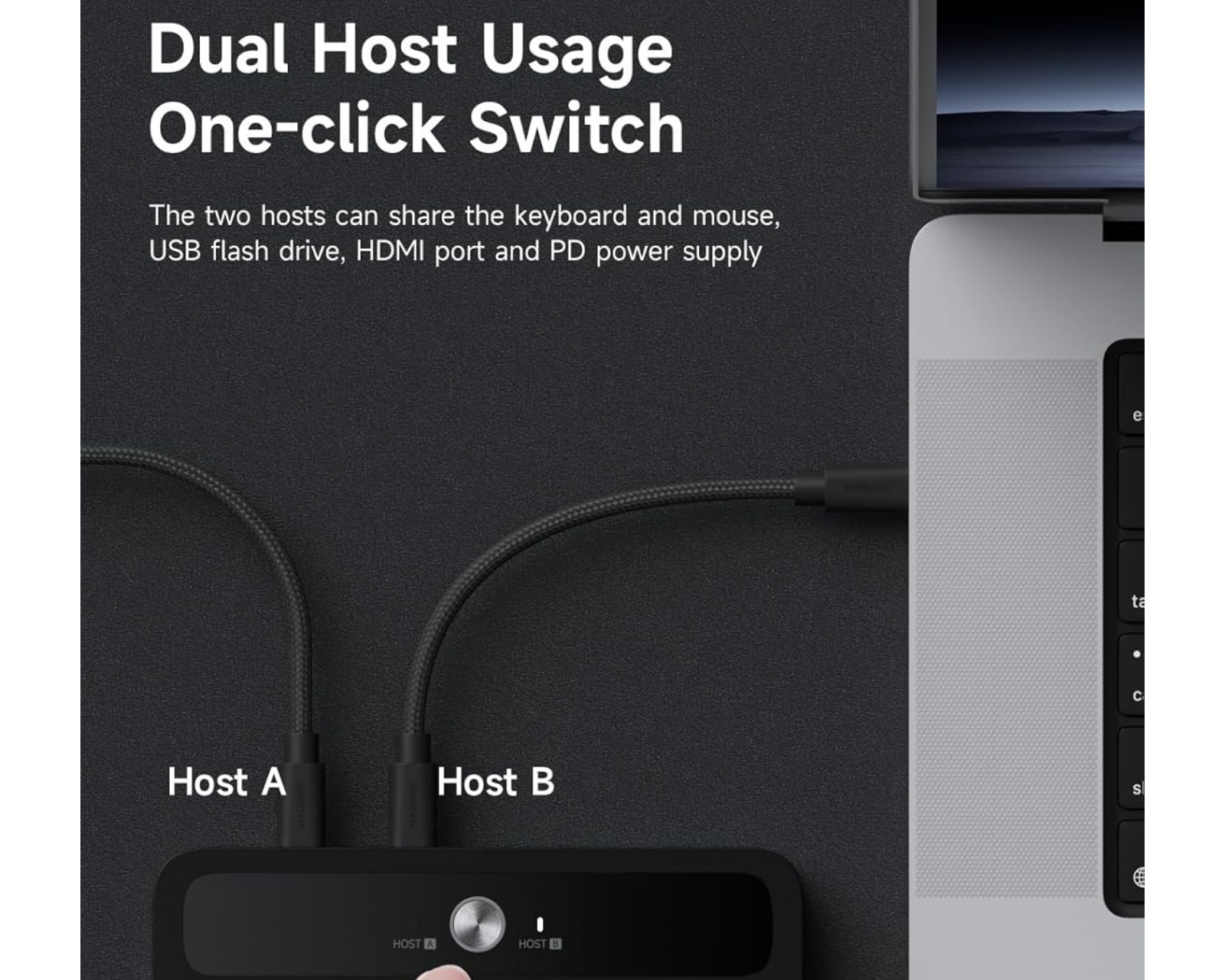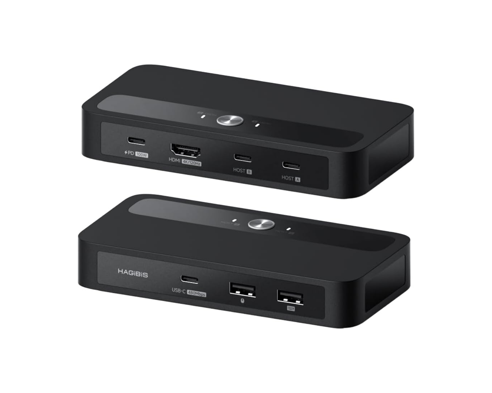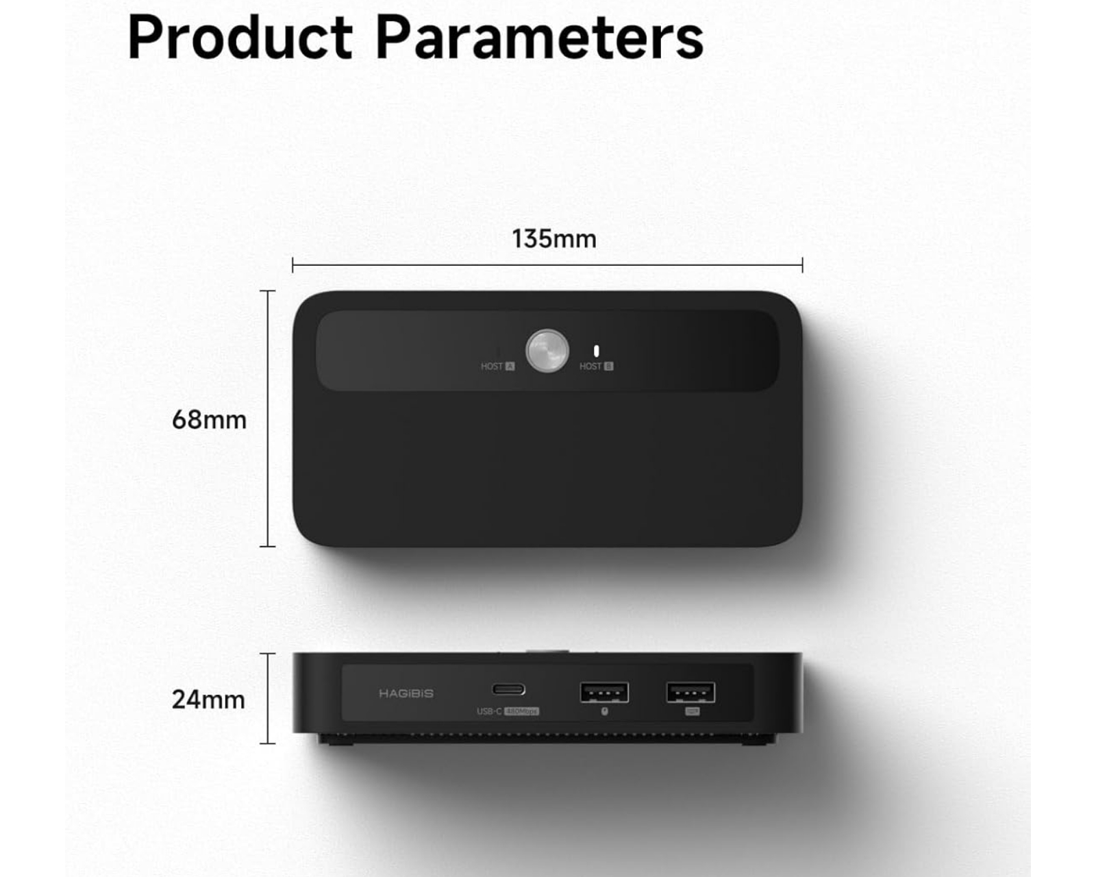 Hagibis KVM Switch är en KVM-switch som möjliggör anslutning av en monitor till två datorer. Den har stöd för 4K@120Hz upplösning via HDMI och erbjuder en 100W PD-strömförsörjning. Produkten är kompatibel med Windows, macOS och Linux, vilket gör den användbar för olika system. Den är avsedd för gamers och professionella användare som behöver dela bildskärm, tangentbord och mus mellan olika enheter.Produkten är utformad med en USB 3.0 Type-C anslutning och innehåller totalt 7 portar, inklusive 4 USB-portar och 2 HDMI-portar. Den utnyttjar PD3.0 (Programmable Power Supply) för att ge upp till 100W dynamisk ström, vilket möjliggör direkt laddning av kraftfulla enheter. Dessutom minimerar designen av kylventiler risken för överhettning och säkerställer effektiv värmeavledning under drift. Den stöder även olika kombinationer av enheter som laptops, stationära datorer och mobila enheter för flexibel användning.