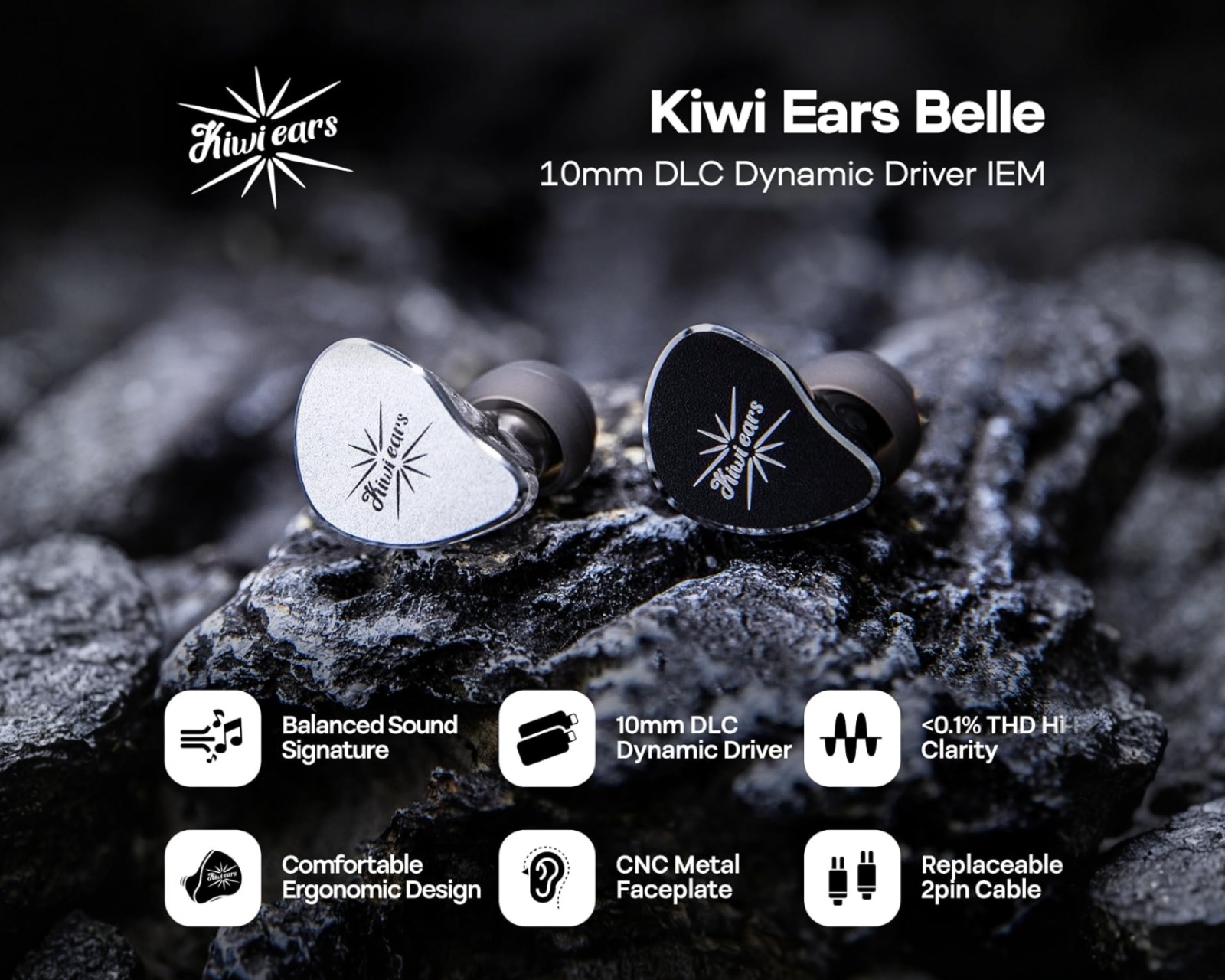 Kiwi Ears Belle är en professionell in-ear monitor (IEM) som kombinerar en 10 mm DLC-dynamisk driver med en tilltalande design och hög ljudkvalitet. Med en impedans på 32 Ohm och ett balanserat tonal signatur, är Belle designad för att ge en engagerande lyssnarupplevelse, oavsett om det handlar om musikproduktion, gaming eller liveframträdanden. Det är en mångsidig hörlur som hanterar olika musikgenrer med djup bas och klara mellanregister, vilket gör den idealisk för både audiophiler och professionella användare.Byggd med CNC-bearbetade metallfrontplattor, erbjuder Belle en premium känsla och hållbarhet. Den senaste generationen av Kiwi Ears Diamond-Like Carbon (DLC) membran bidrar till en snappare och mer responsiv ljudåtergivning, med en total harmonisk distorsion (THD) på mindre än 0,1% vid 1 kHz. Kabelalternativen inkluderar typ C och 3,5 mm, vilket ger flexibilitet beroende på enhetsanvändning. Den silvrade pläterade kabeln maximerar signalöverföringen och förmågan att återskapa högfrekventa detaljer, vilket ger en överlägsen ljudupplevelse. Belle är avsedd för dem som söker det bästa ljudet både på resande fot och under liveframträdanden.