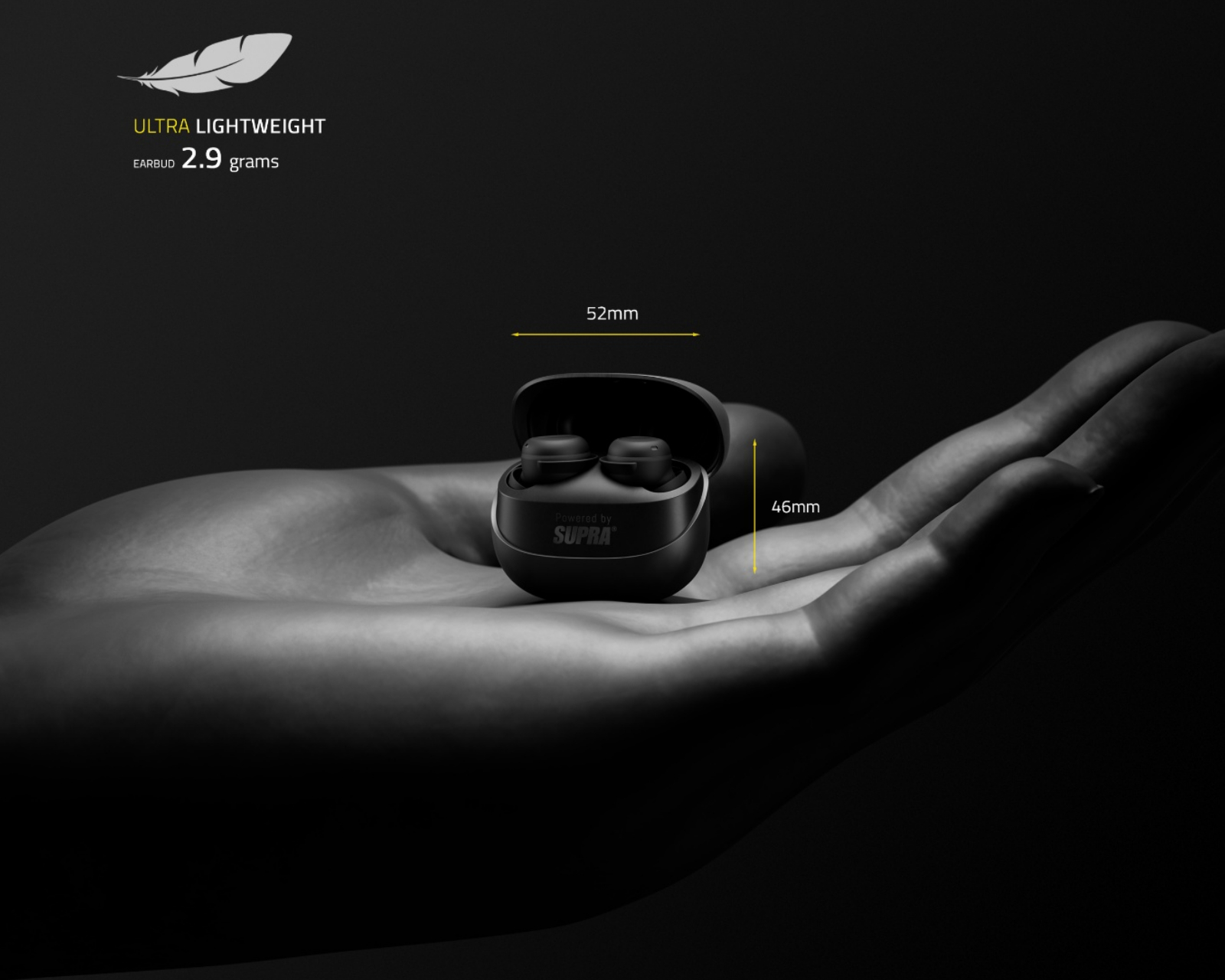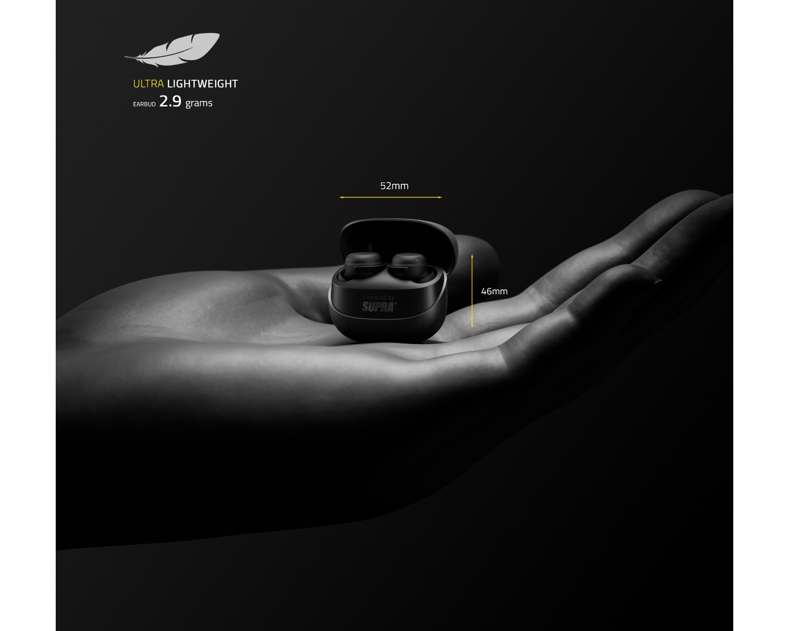 SUPRA ZERO-TX2 Mini TWS är ultrakompakta in-ear hörlurar från Supra. De har en design som möjliggör låg vikt på endast 2,9 gram per earbud och levererar över 25 timmars speltid genom det medföljande laddningsetuiet på 30 gram. Hörlurarna är IPX5-certifierade för att tåla svett och regn, och passar både gymmet och arbetet.ZERO-TX2 Mini är konstruerade av militärklassade material, vilket garanterar hållbarhet och robusthet. Ljudet har utvecklats enligt SUPRA:s prisbelönta ljuddesign för att leverera kraftfull och dynamisk ljudåtergivning med imponerande bas. Dubbla ENC-mikrofoner med MEMS™-teknologi bidrar till att minimera störande omgivningsljud, vilket ger klar röståtergivning. Med smarta touchkontroller kan användaren enkelt styra samtal och musik, samt aktivera röstassistenter som Google™ eller Siri™. Dessutom stödjer hörlurarna TWS Mono-funktionen för användning av en hörlur i taget.
