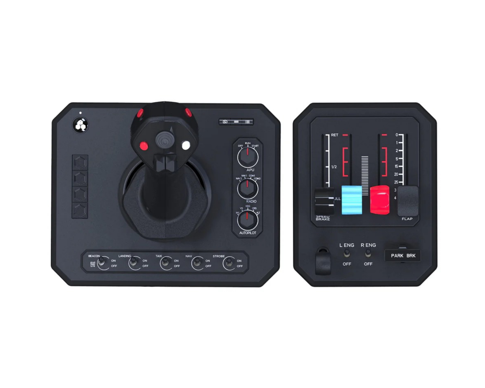 Sortimentet omfattar bland annat Alpha Flight Controls Yoke & Switch Panel, Bravo Throttle Quadrant med stöd för flera flygplanstyper samt Charlie Rudder Pedals med aluminiumkonstruktion och Hall-effektsensorer för hög precision och lång livslängd.