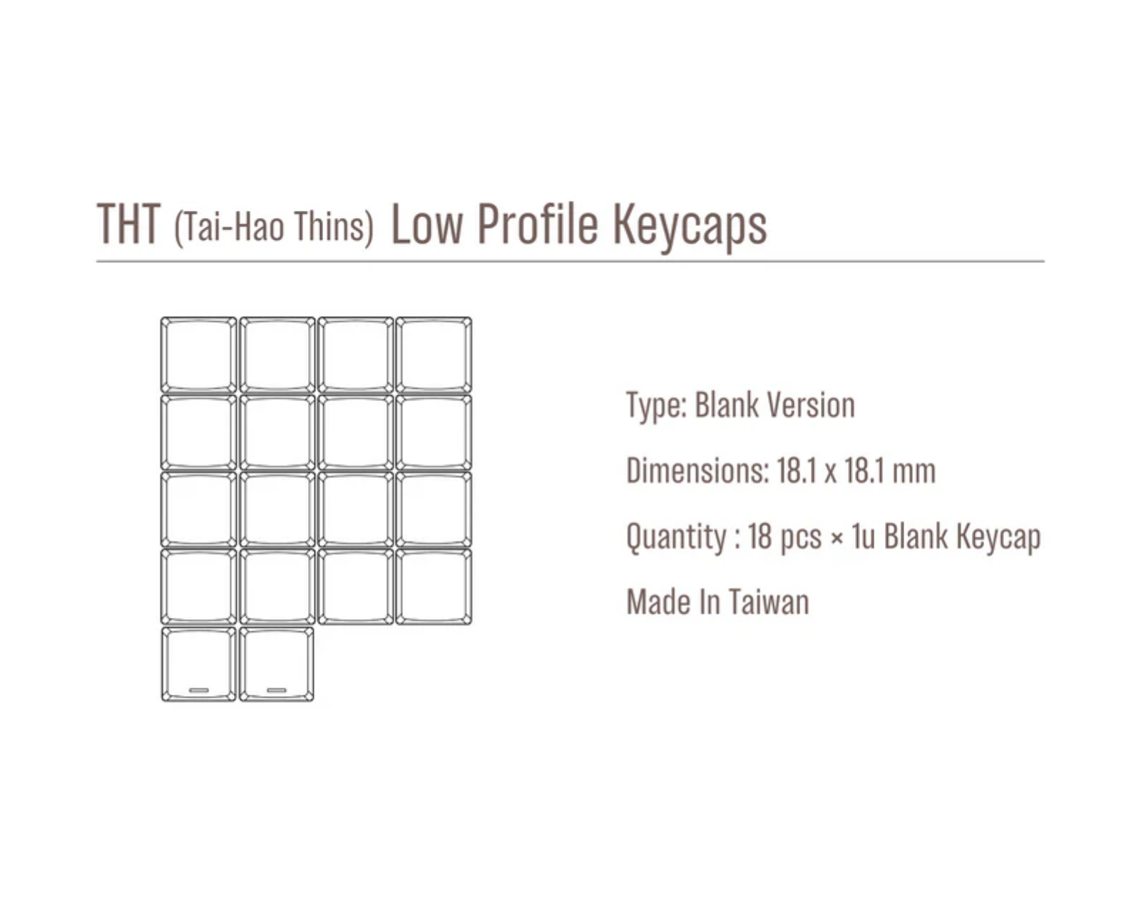 Low-profile keycaps är ett set med 18 stycken blank keycaps från Tai-Hao, tillverkat i PBT-material. Setet innehåller 16 keycaps samt 2 bonusnycklar och är designat för användning med Choc V1-switchar. Keycapsen har en THCS-profil och måtten är 16,5 × 17,5 mm. Det specifika PBT-materialet ger hög hållbarhet och slitagebeständighet, vilket är särskilt viktigt för gamers som söker långvarig prestanda.Den låga profilen bidrar till en ergonomisk skrivupplevelse, medan de tysta tangenttryckningarna minimerar ljudnivån. Den minimalistiska designen utan märkningar ger en stilren estetik som passar olika setup-konfigurationer.