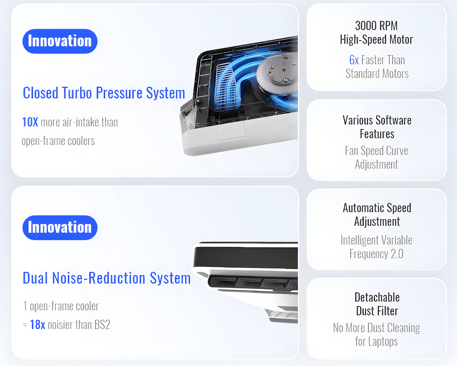 FLYDIGI BS2 Laptop Kylare är en högpresterande kylplatta från Flydigi, utformad för att effektivt sänka temperaturen på laptopens CPU och GPU. Med en labbtestad temperaturminskning på upp till 36°C, förbättrar den både prestanda och stabilitet under krävande uppgifter som gaming och videoredigering. Kylplattan har en ljudnivå på maximalt 53 dB, vilket gör den tystare än de flesta inbyggda fläktar i datorer.Byggd med en innovativ sluten turbo trycksystem, erbjuder BS2 en Luftintag som är 10 gånger mer effektivt än öppna kylningssystem. Den har en duell ljudreducerande struktur som inkluderar ett intag för ljuddämpning och ett interna flödesrätare för att eliminera oönskade högfrekventa ljud. Kylplattan har en hastighet av 3000 RPM och tre olika lägen; Stormläge, Standardläge och Tystläge, vilket ger en flexibel kylningsprestanda. Med den intelligenta temperaturkontrollen 2.0 justeras fläkthastigheten automatiskt baserat på användning, vilket säkerställer optimal kylning, oavsett om du spelar eller ser på video. En dammsäker design med ett avtagbart nät gör det enkelt att hålla enheten ren och i perfekt skick.