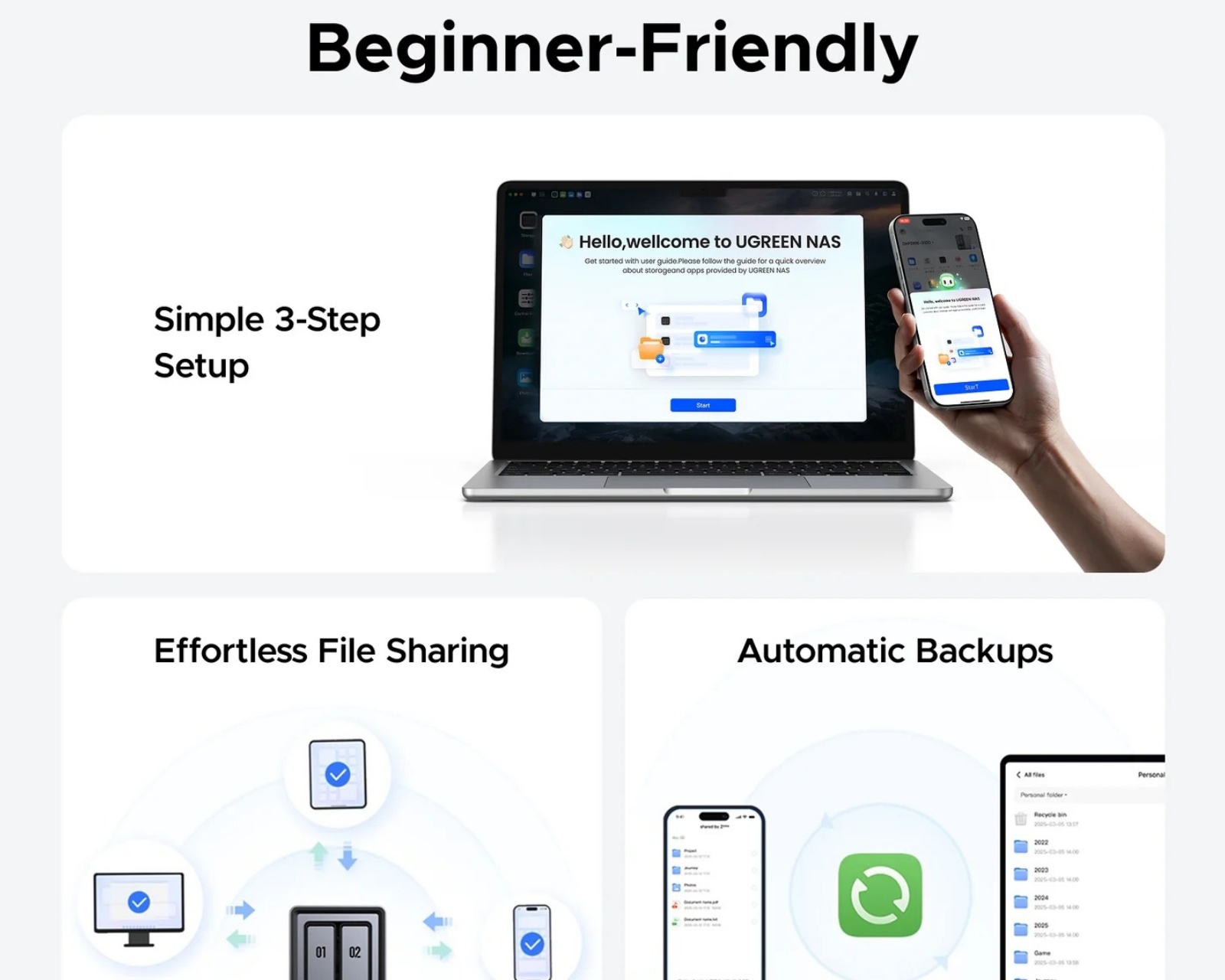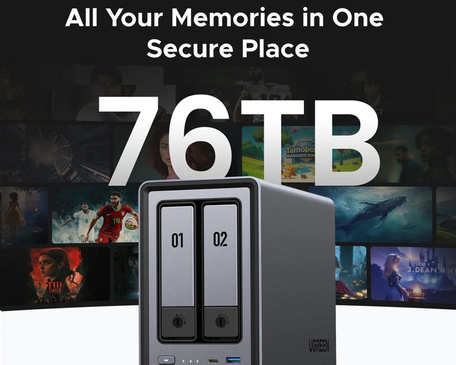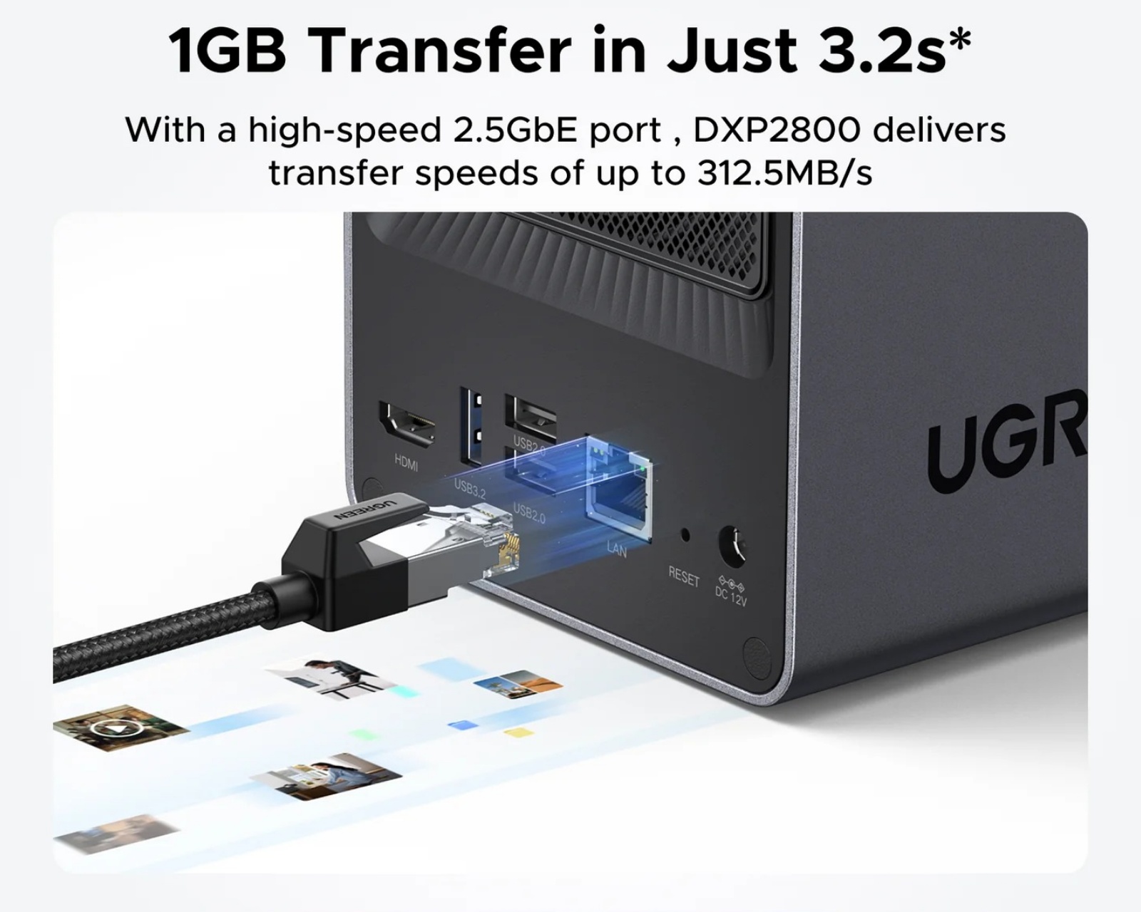 UGREEN NASync DXP2800 är en NAS (Network Attached Storage) från UGREEN med två fack. Den är utrustad med en Intel N100 fyrkärnig CPU, 8GB DDR5 RAM och en 2.5GbE LAN-port. Enheten erbjuder 76TB lagringskapacitet, vilket gör den lämplig för säkerhetskopiering av data, automatiserade fotoalbum och hemmabio. Den är designad för användare som behöver en tillförlitlig lagringslösning med enkel åtkomst och delning över flera enheter.UGREEN NASync DXP2800 har en byggkvalitet som garanterar en lång livslängd och stabil drift. Den stöder tredjeparts hårddiskar från populära tillverkare som Western Digital och Seagate. Genom sin AI-funktion för bildhantering kan den automatisk sortera bilder baserat på ansikten, platser och objekt, samt ta bort dubbletter. Anslutningar inkluderar 4K HDMI för videoöverföring och en hög hastighet med 2.5GbE för nätverksanslutning, vilket gör filöverföringar smidiga och snabba. Enheten har också ett effektivt kylsystem som håller ljudnivåerna låga.