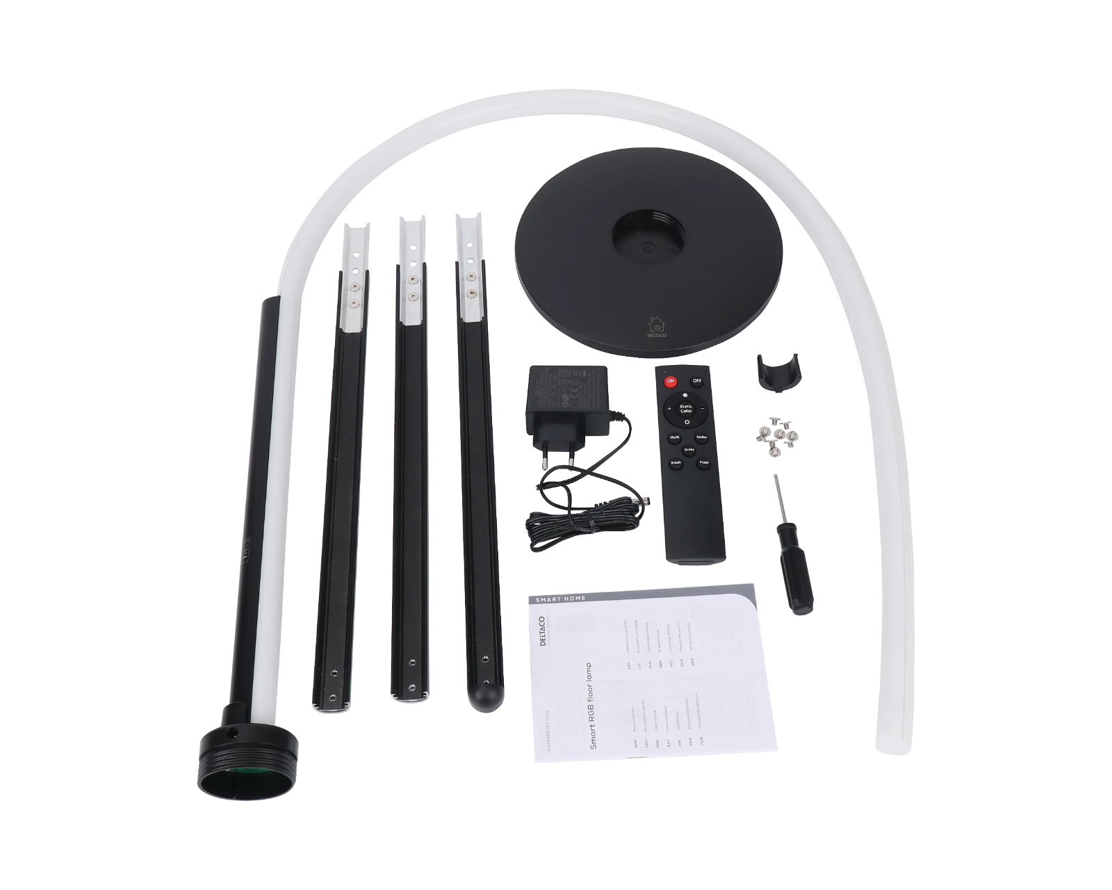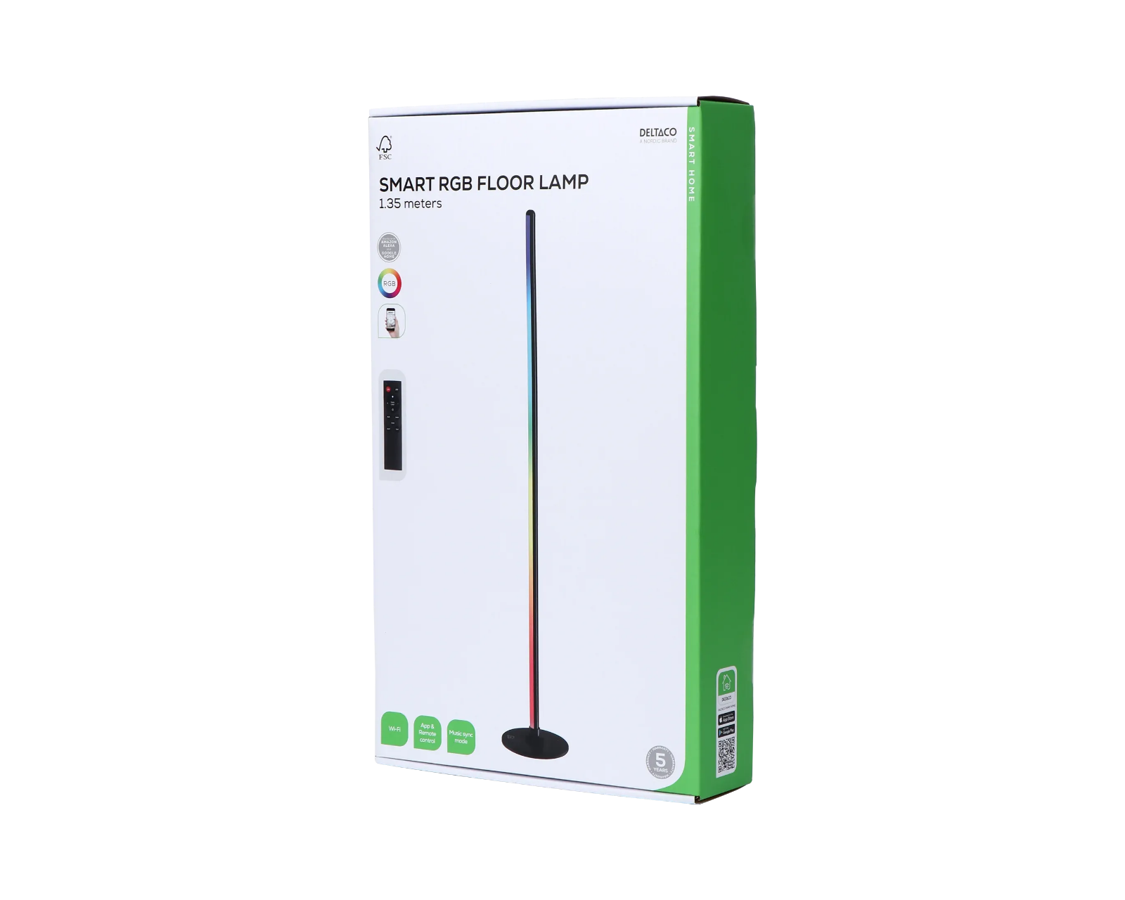 Smart Home Golvlampa är en golvlampa från Deltaco Smart Home som erbjuder fjärr- och appstyrning. Med en höjd på 1,35 meter och stöd för RGBIC-teknologi visas flera färger samtidigt, vilket skapar imponerande ljuseffekter och övergångar. Den är utformad för att passa in i moderna hem och används i allt från vardagsrum till kontor.Lampan är utrustad med 93 LED-lampor och har en livslängd på 20 000 timmar. Den fungerar med WiFi 2,4 GHz och IEEE 802.11b/g/n-standarder. Kontrollen kan ske antingen via den medföljande fjärrkontrollen för omedelbara inställningar av färg, ljusstyrka och olika lägen, eller genom Deltaco SMART HOME-appen som ger möjligheten att justera lampan från smartphone för mer bekvämlighet. Lampan är dessutom kompatibel med Google Home och Amazon Alexa för röststyrning.