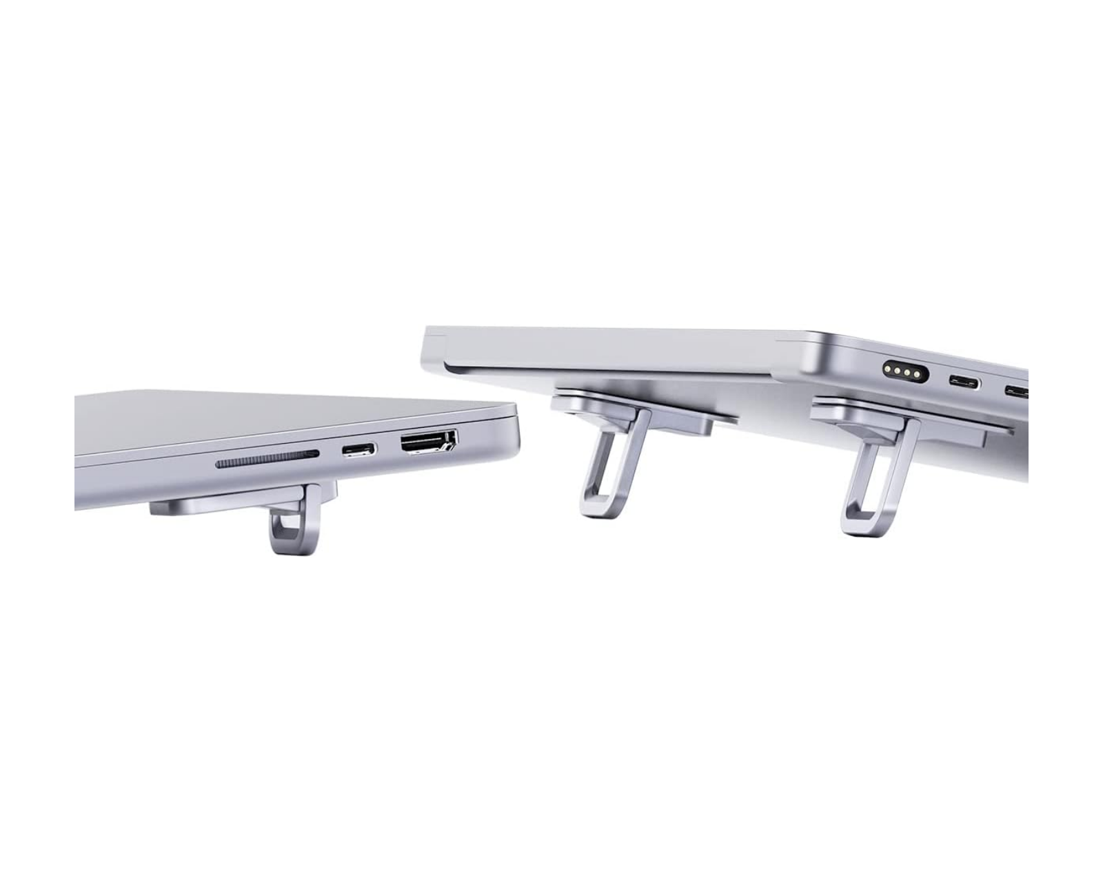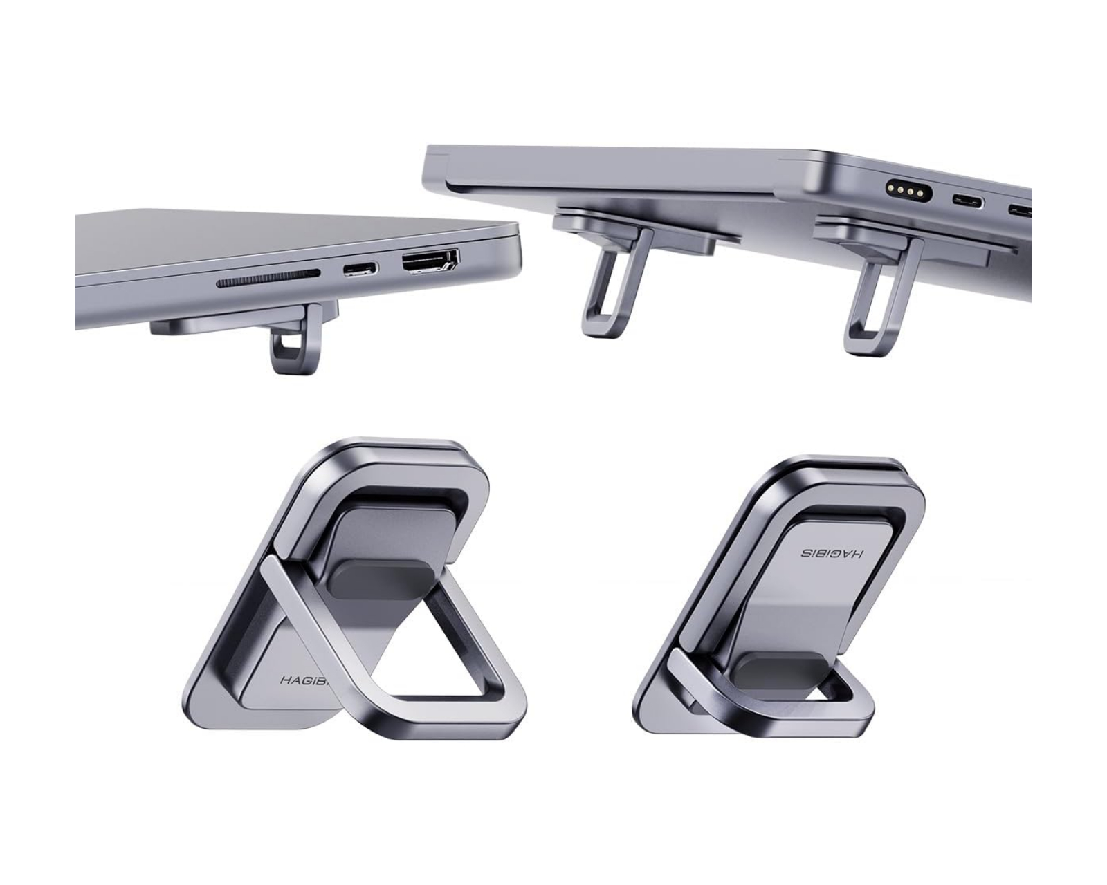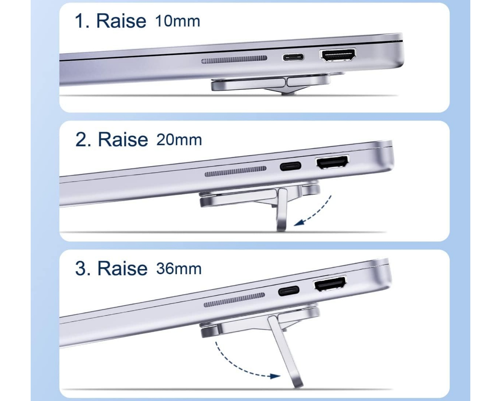 Hagibis Laptopställ är en justerbar enhet som möjliggör ergonomisk användning av bärbara datorer. Standen är tillverkad av ett aluminiumlegering som också fungerar som en värmeavledare för att förbättra avkylningen av datorn. Den erbjuder tre olika höjder att justera mellan, vilket gör den mångsidig för olika användningssätt. Stället är lämpligt för användning med bärbara datorer mellan 12 och 17 tum, vilket gör den idealisk för både studenter och yrkesverksamma.Materialet i Hagibis Laptopställ är ytbehandlat för att ge en stabil och hållbar konstruktion. Den har en design som ökar luftcirkulationen och förhindrar överhettning genom att lyfta datorn från ytan den placeras på. Höjden kan justeras i tre steg: 10mm, 20mm och 36mm, vilket möjliggör en anpassad arbetsställning. Den faktiska ytans förstoring bidrar också till att öka stabiliteten, vilket minskar risken för att den bärbara datorn ska tippa över. Standen är kompatibel med både MacBook-modeller och andra bärbara datorer samt surfplattor.