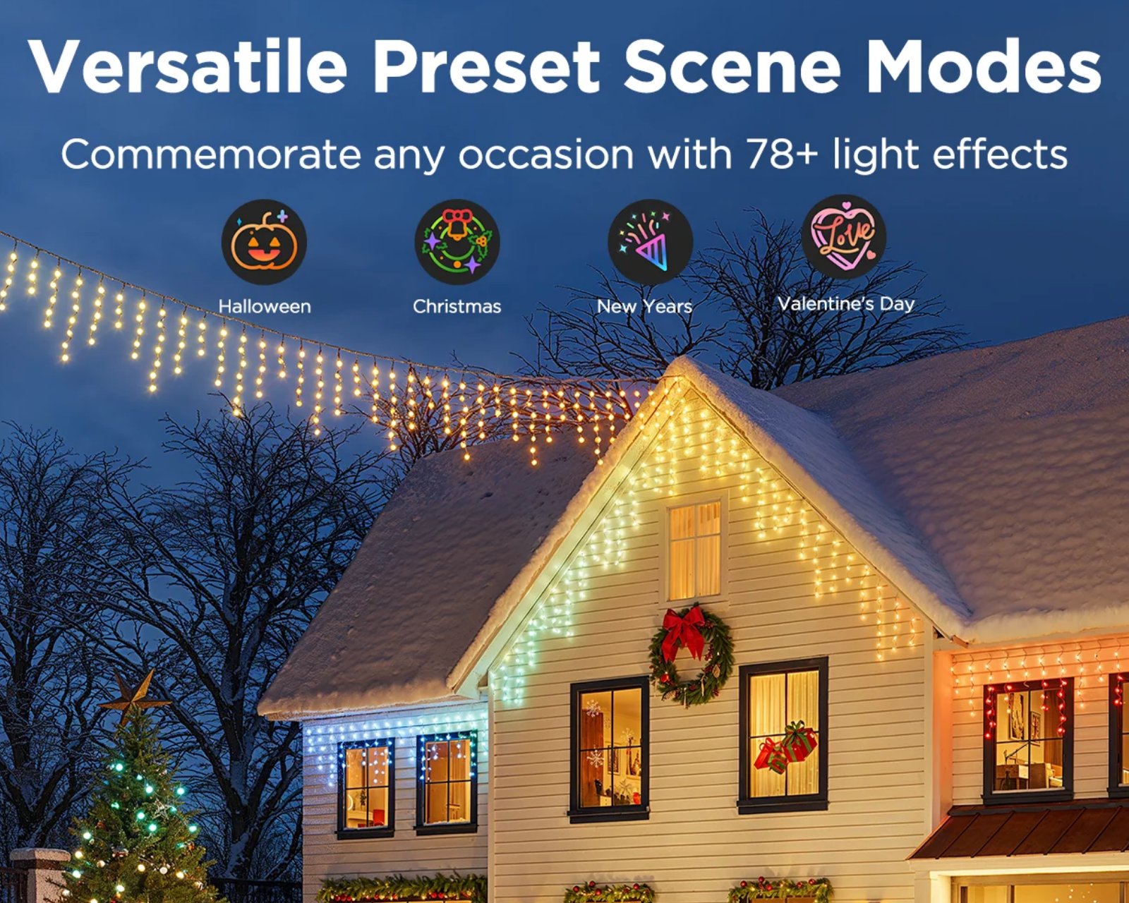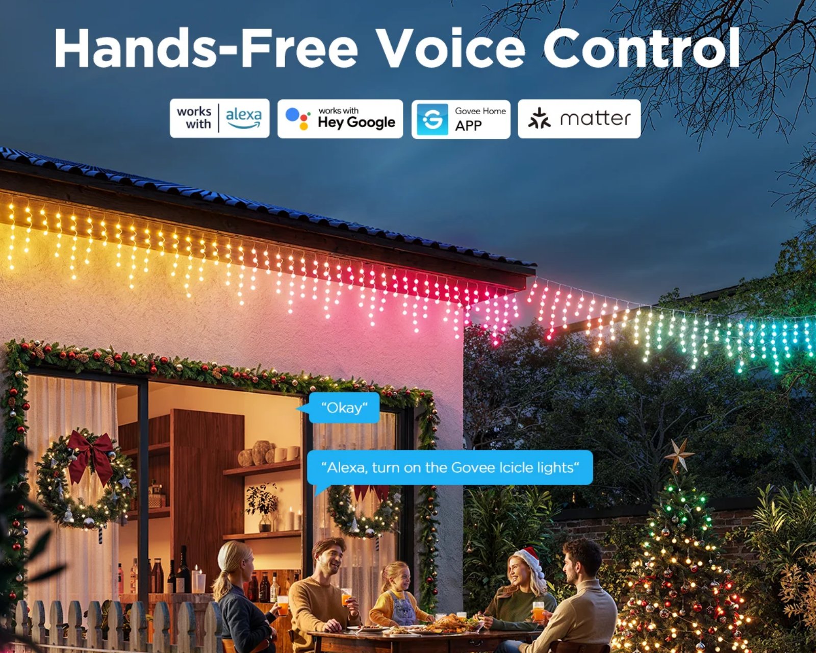 Govee Icicle Ljus är en LED-ljusslinga från Govee som skapar en färgglad och festlig atmosfär utomhus. Denna 10 meter långa ljusslinga erbjuder upp till 16 miljoner färger och har oberoende chips i varje lampa, vilket ger en stor variation av ljuseffekter för att anpassa din juldekoration. De tätt placerade lamporna säkerställer en bred ljusspridning och extra ljusstyrka.Ljusslingan använder avancerad Uni-IC-teknik vilket ger preciserade färger och mjuka ljusövergångar. Govee Home-appen ger tillgång till över 78 förinställda ljusscener och AI-genererade effekter som kan anpassas med text, ljud och bild. Med IP65-klassificering är ljusslingan skyddad mot både vatten och damm, vilket gör den lämplig för utomhusbruk under kalla vintermånader. Den kan styras via Alexa, Google Assistant och Matter, eller genom Govee Home-appen.