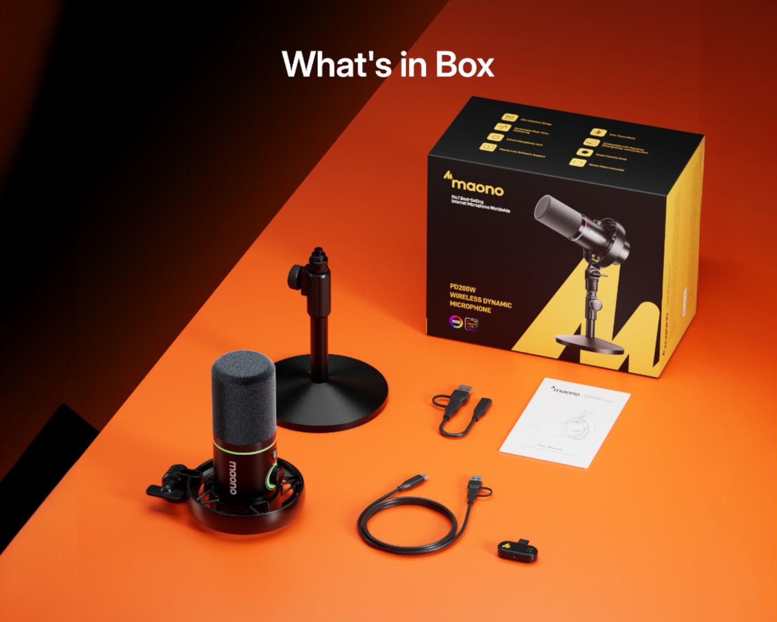 PD200W är en hybridpodcastmikrofon från Maono som erbjuder trådlös, USB- och XLR-anslutning för flexibel inspelning. Den är utrustad med en 30 mm dynamisk mikrofonkapsel och en kardioid pickup, vilket möjliggör professionell ljudinspelning. Den är speciellt designad för användare som kräver hög ljudkvalitet och mångfald i sin inspelningsteknik.Enheten är byggd med högkvalitativa komponenter och levererar ljud med en signal/brus-förhållande på 82 dB och en ljudtrycksnivå på 128 dB. PD200W har en trådlös räckvidd på upp till 60 meter och en batteritid på upp till 60 timmar med RGB-lamporna avstängda. Dessutom är den försedd med en AI-baserad brusreduceringsfunktion som minimerar oönskat bakgrundsljud. Användarna kan enkelt justera ton och efterklang via MaonoLink-appen.